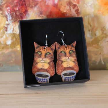 Ateljee Tiitu Peltomaan Kahvikissa -korvakorut on suloisen lämminhenkiset koivuvanerikorvikset kissojen ystäville ja kahvifaneille!