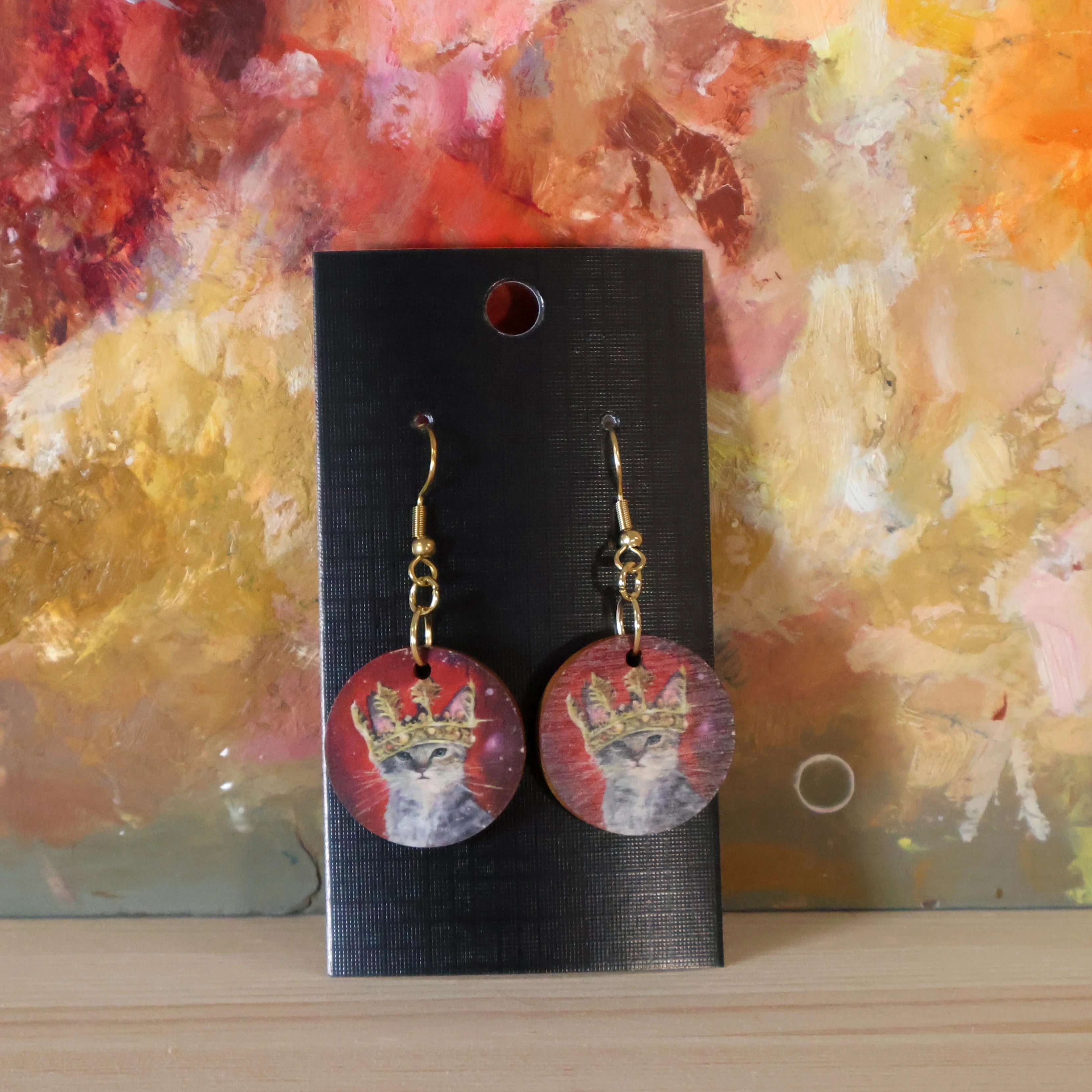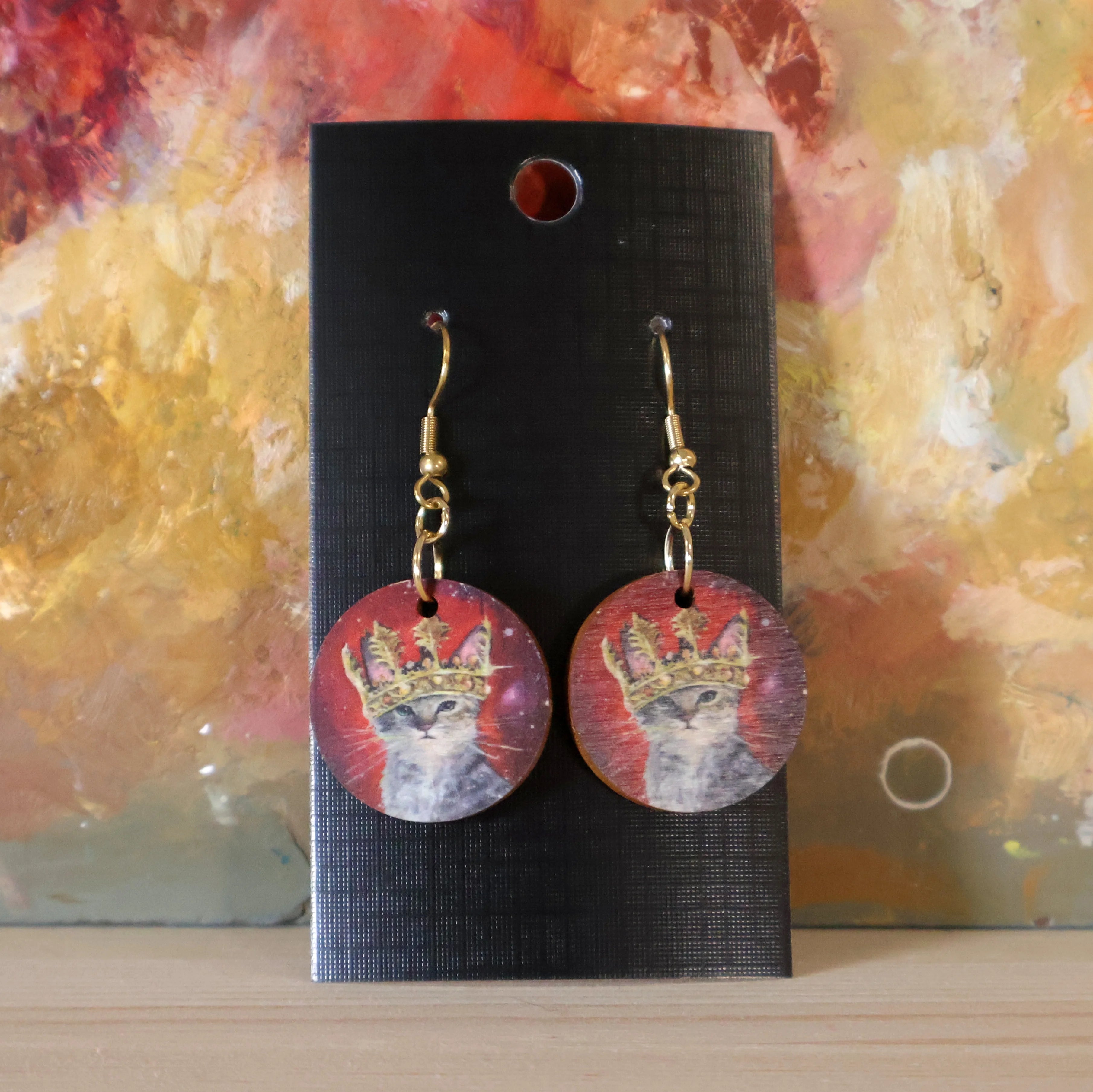 Ateljee Tiitu Peltomaan Kuningaskissa-korvakorut hurmaavat arvonsa tuntevalla kissahahmolla, joka poseeraa kruunu päässään. Punainen tausta korostaa kuvitusta kauniisti ja tekee koruista pienen, mutta näyttävän yksityiskohdan asuun.