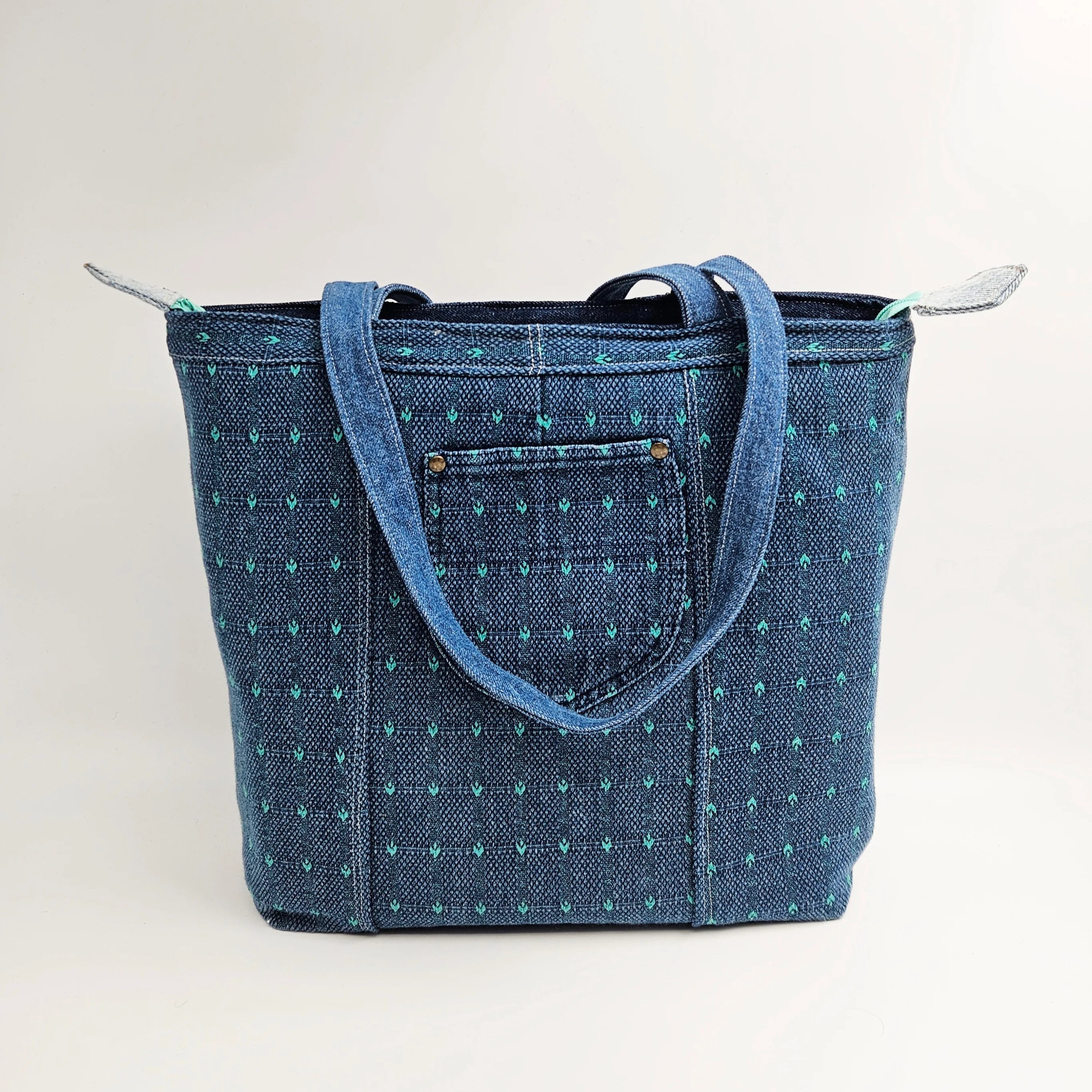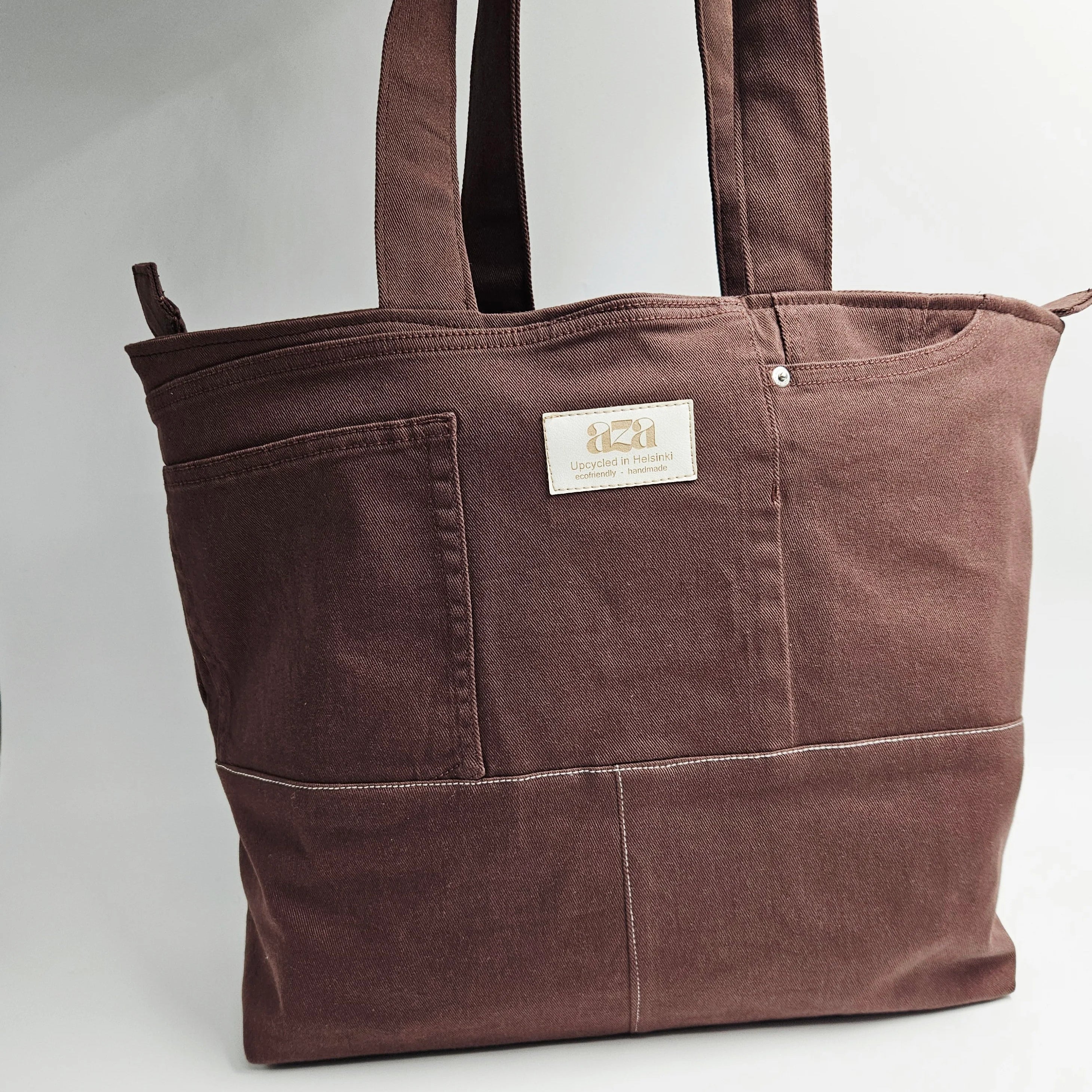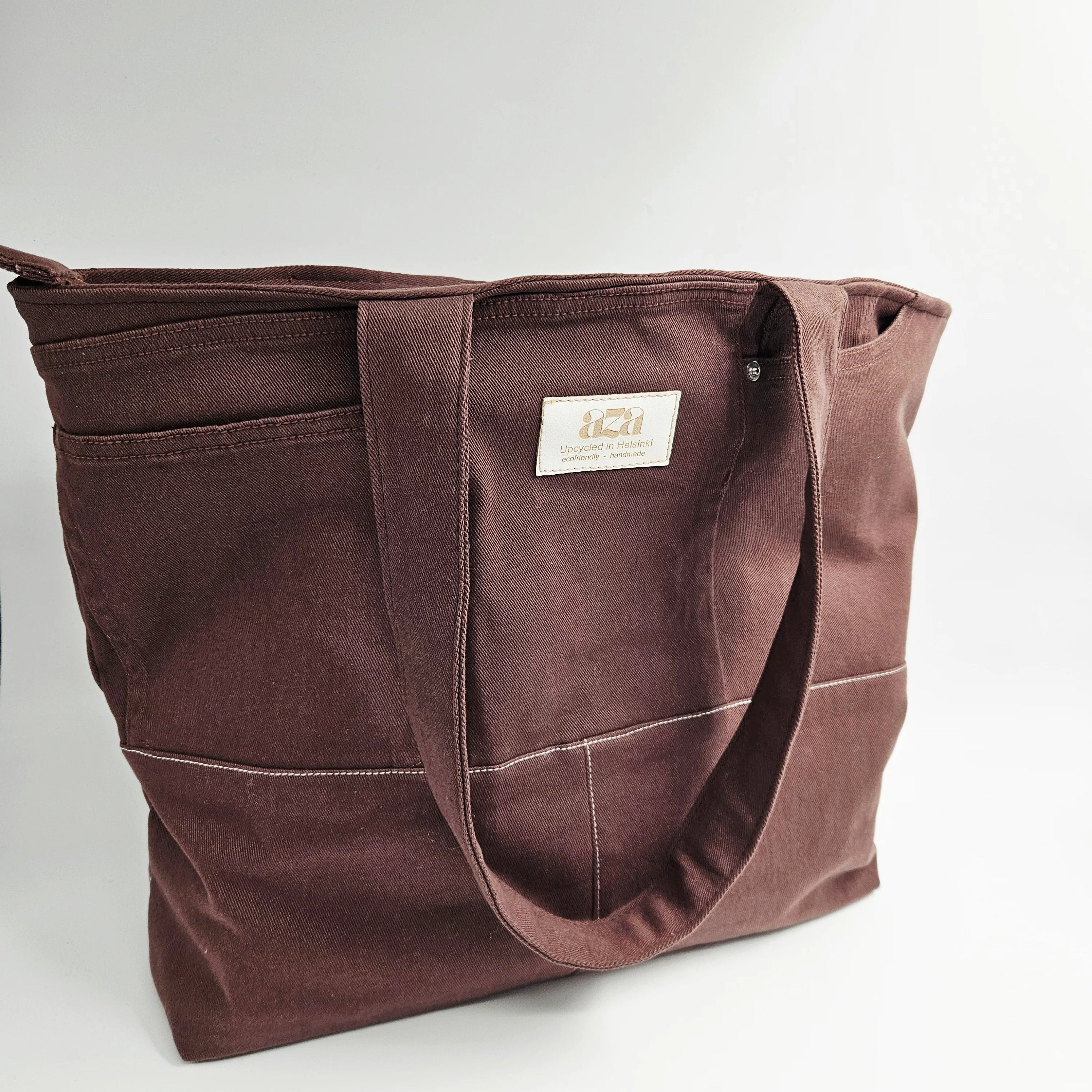 Aza Ecotiquen vetoketjullinen Tote Bag toimii täydellisenä kangaskassina arkeen, matkalle ja töihin. Tilava ja tyylikäs kassi on valmistettu käsin Helsingissä kierrätetyistä materiaaleista , joten jokainen kangaslaukku on uniikki ja vastuullinen valinta.
