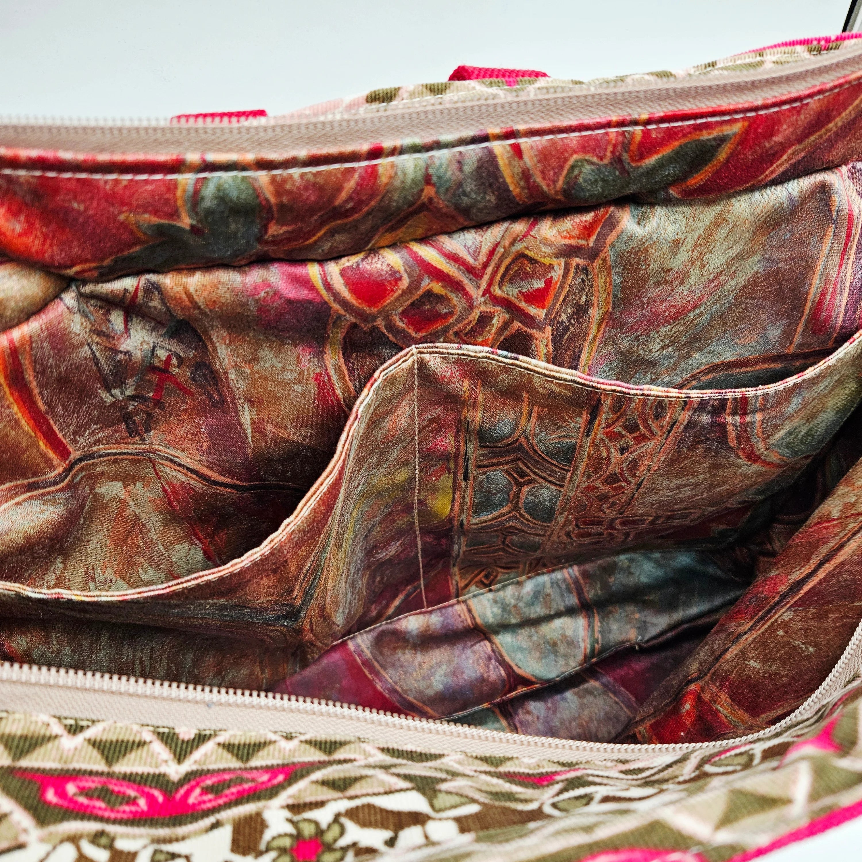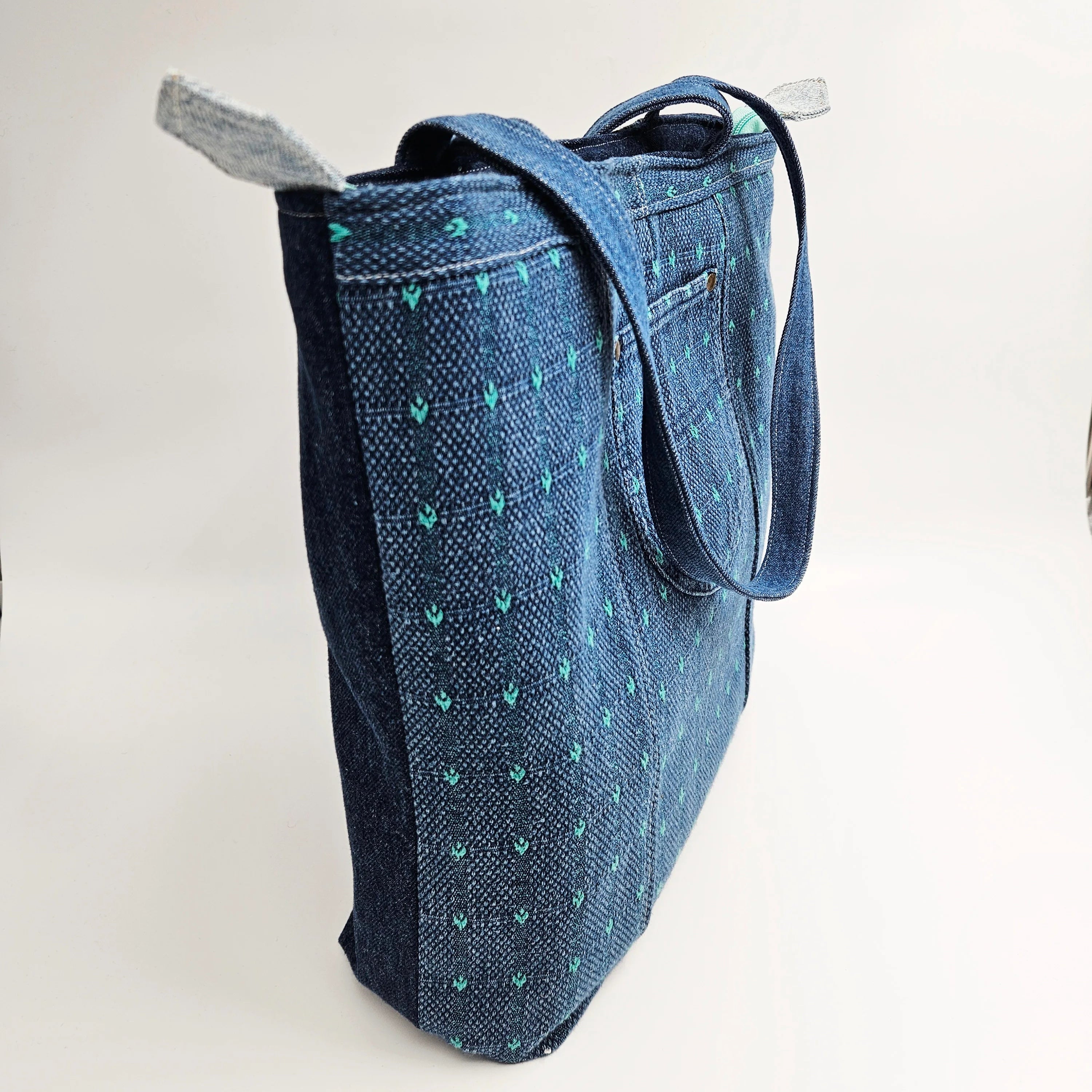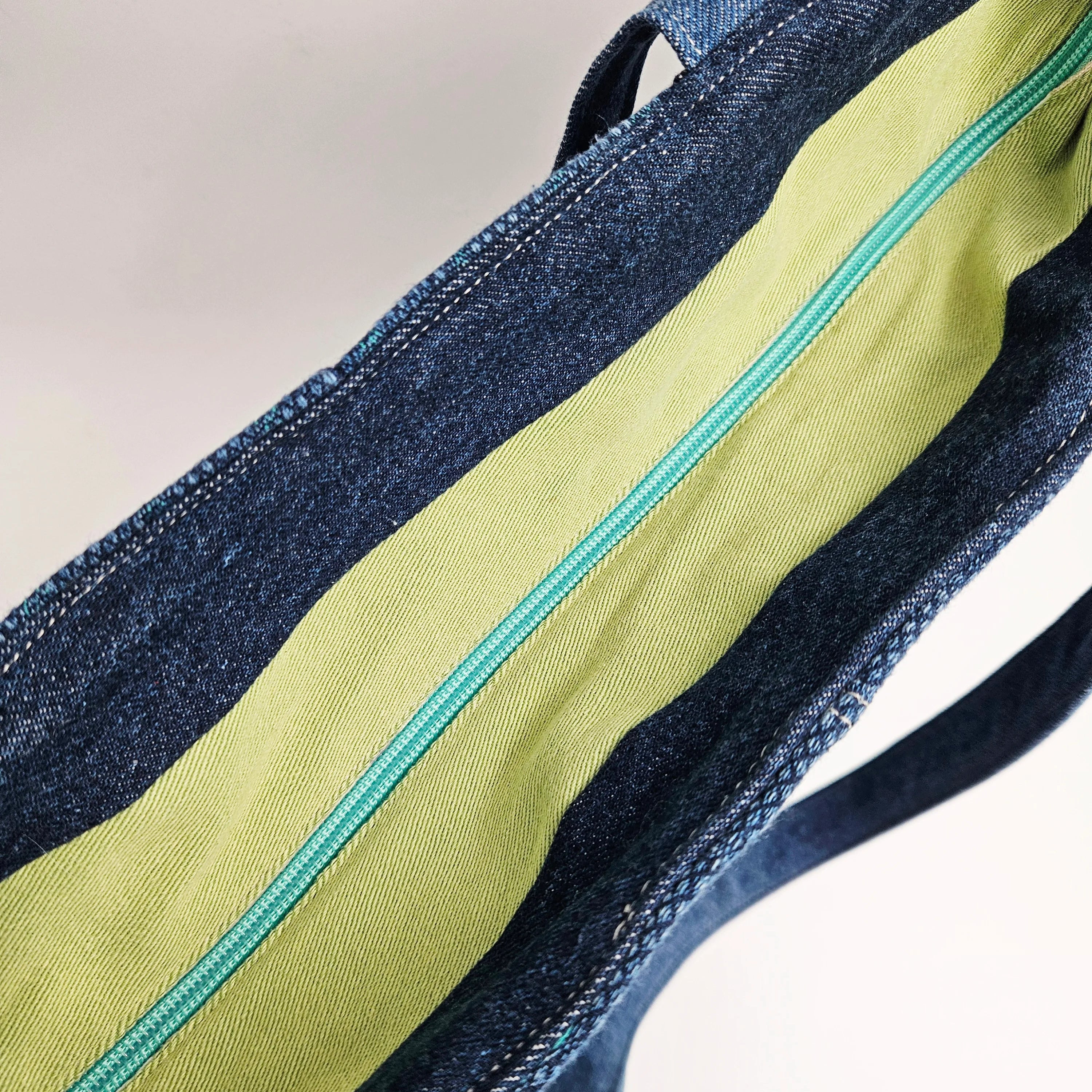 Upcycled laukku tarjoaa reilusti tilaa läppärille, viikonloppureissun tavaroille tai rantapäivään. Iso tote bag sulkeutuu vetoketjulla, mikä tekee siitä käytännöllisen ja turvallisen valinnan kaupungille ja liikkeellä oloon. Vuoritettu sisus tuo kestävyyttä ja ryhtiä, ja sisätaskut pitävät pienemmät tavarat, kuten puhelimen ja lompakon, helposti saatavilla.