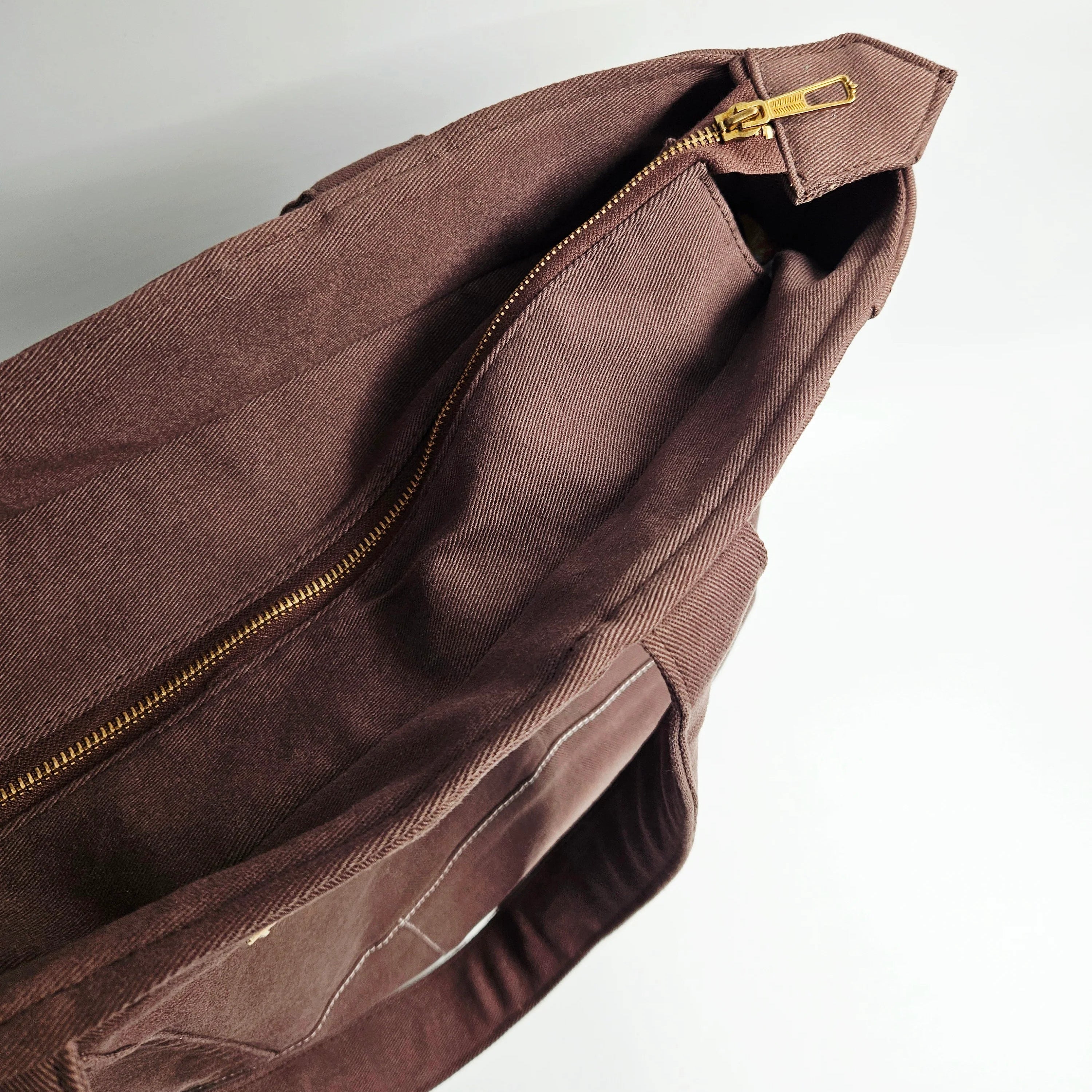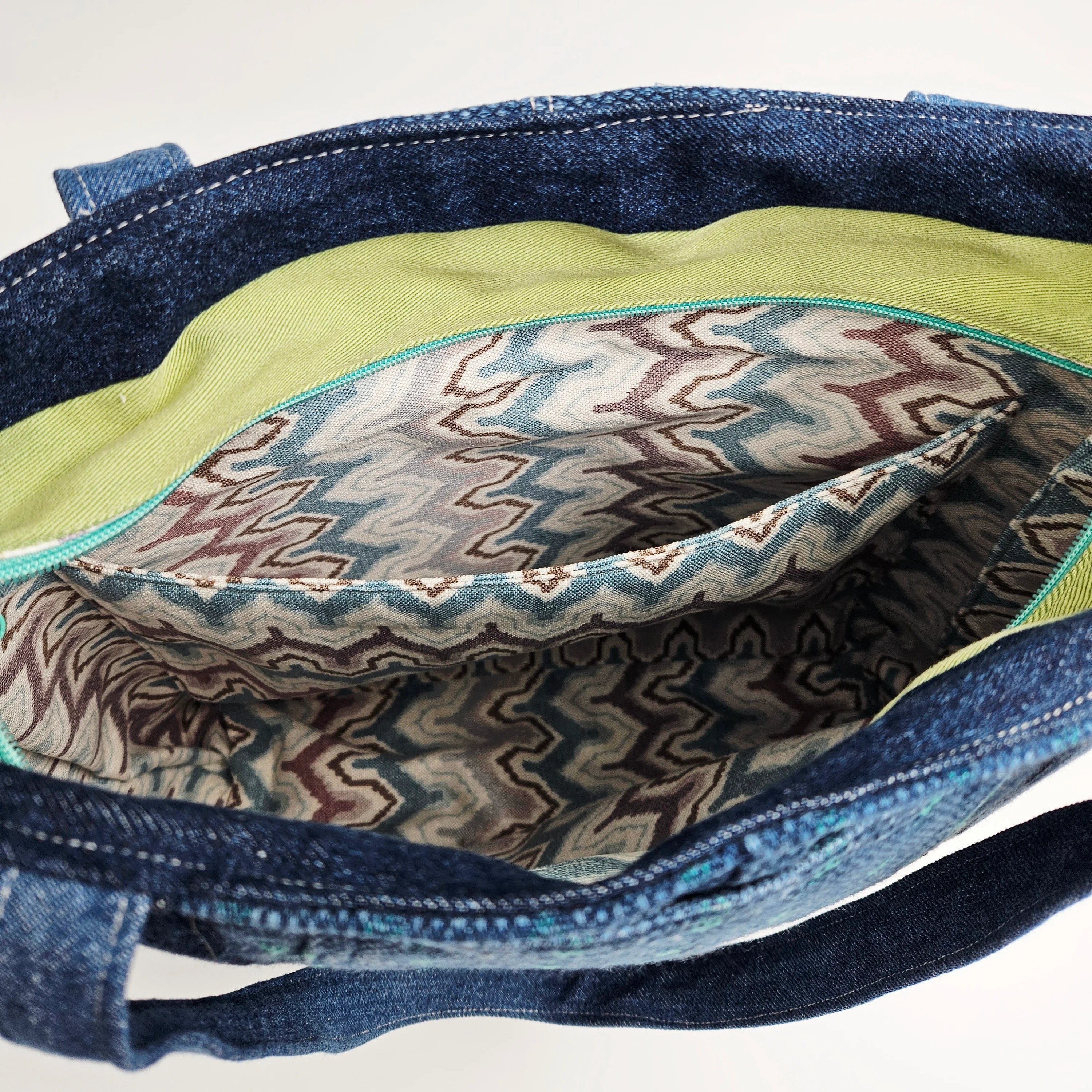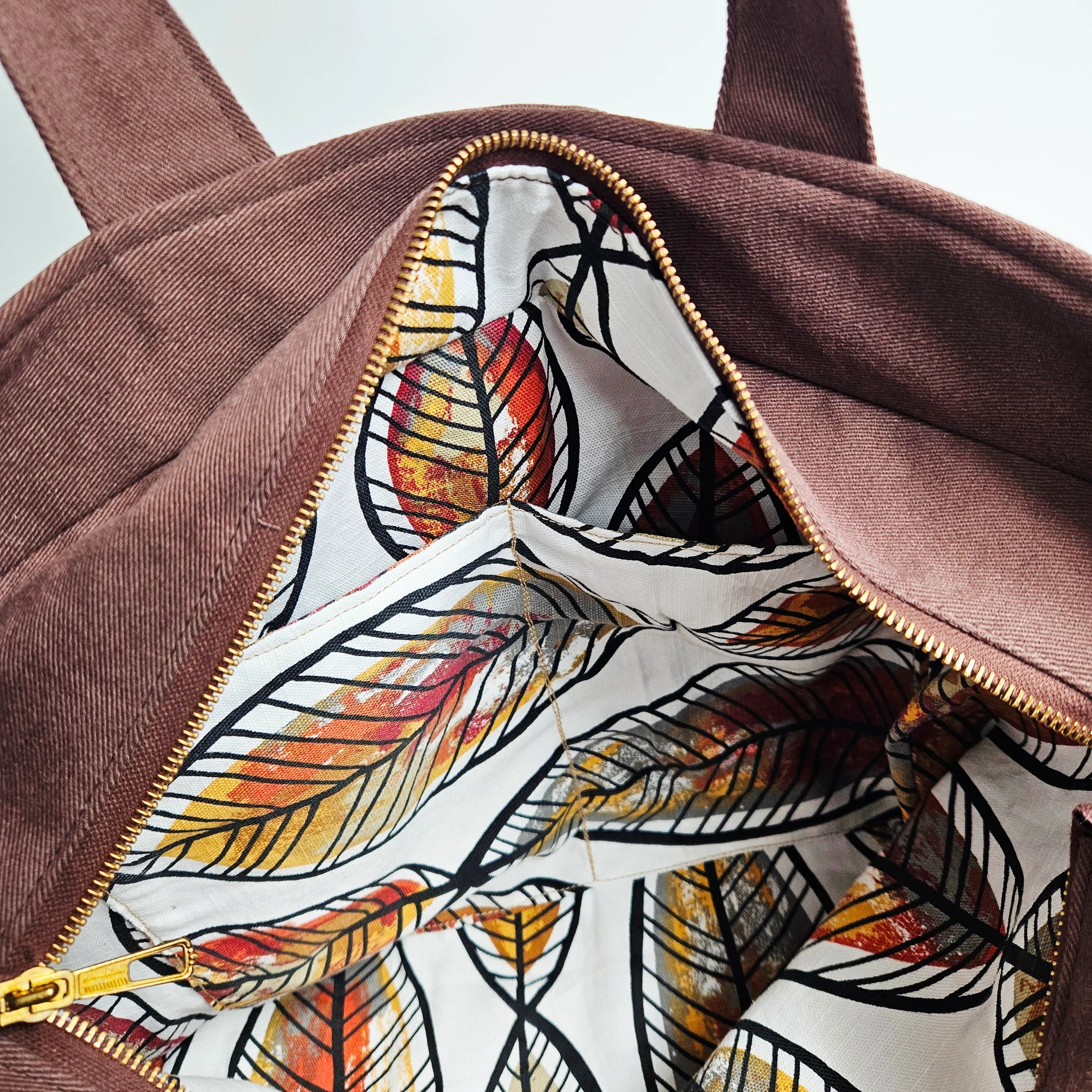 Upcycled laukku tarjoaa reilusti tilaa läppärille, viikonloppureissun tavaroille tai rantapäivään. Iso tote bag sulkeutuu vetoketjulla, mikä tekee siitä käytännöllisen ja turvallisen valinnan kaupungille ja liikkeellä oloon. Vuoritettu sisus tuo kestävyyttä ja ryhtiä, ja sisätaskut pitävät pienemmät tavarat, kuten puhelimen ja lompakon, helposti saatavilla.