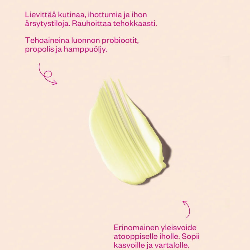 Täyteläinen mutta hyvin imeytyvä koostumus yhdistää ihoa suojaavan propoliksen, ihoa vahvistavat probiootit sekä luomuöljyt, jotka kosteuttavat ja tukevat ihon omaa suojamuuria. Antimikrobiset ja tulehdusta lievittävät eteeriset öljyt auttavat rauhoittamaan punoitusta, kutinaa ja epämukavaa kiristystä.