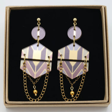 Rombibronzen Himmeli Chains -korvakorut on astetta näyttävämmät korvakorut, joista ei puutu välkettä ja asennetta! Rohkean näyttävissä korvakoruissa yhdistyvät kultapeiliakryylin lumoava kiilto ja rokahtavaa persoonallisuutta tuovat ketjudetaljit! Akryylin pinta on joko yksivärinen läpileikatulla kuviolla tai viimeistelty pintaan printatulla katseenvangitsevalla kuvioinnilla.