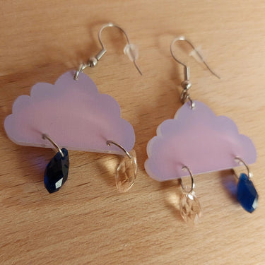 Sydänpilven materiaalina on kaunis Aurora-akryyli, joka loistaa valossa revontulten väreissä. Pisara- ja kristallipilven materiaali on kaunista iridescent-/sateenkaariakryyliä, jonka kiilto pääsee valloilleen koruosan taustapuolella. Kuva on painettu akryyliin valkoisen maalikerroksen päälle, mikä tekee kuvasta kirkkaan ja tarkan.