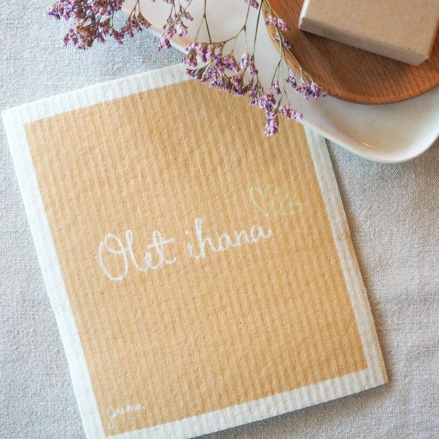 Saima Visualsin ympäristöystävällinen tiskirätti tuo iloa keittiöön harmonisen kauniilla kuvituksellaan! Ekologinen kestotiskirätti on valmistettu selluloosakuidusta ja puuvillasta, ja se on sekä biohajoava että uudelleenkäytettävä – täydellinen valinta kestävään arkeen.