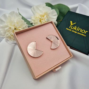 Yukinorin Kata-nappikorvakorut ovat kunnianosoitus selkeälle, graafiselle muotokielelle. Inspiraatio on saatu viuhkan kauniista muodosta, joka toistuu korussa modernina ja näyttävänä siluettina. Kimaltava peiliakryyli ja tarkat laserkaiverrukset luovat hienostuneen kontrastin, joka tekee Katasta täydellisen korun niin arkeen kuin juhlaan.