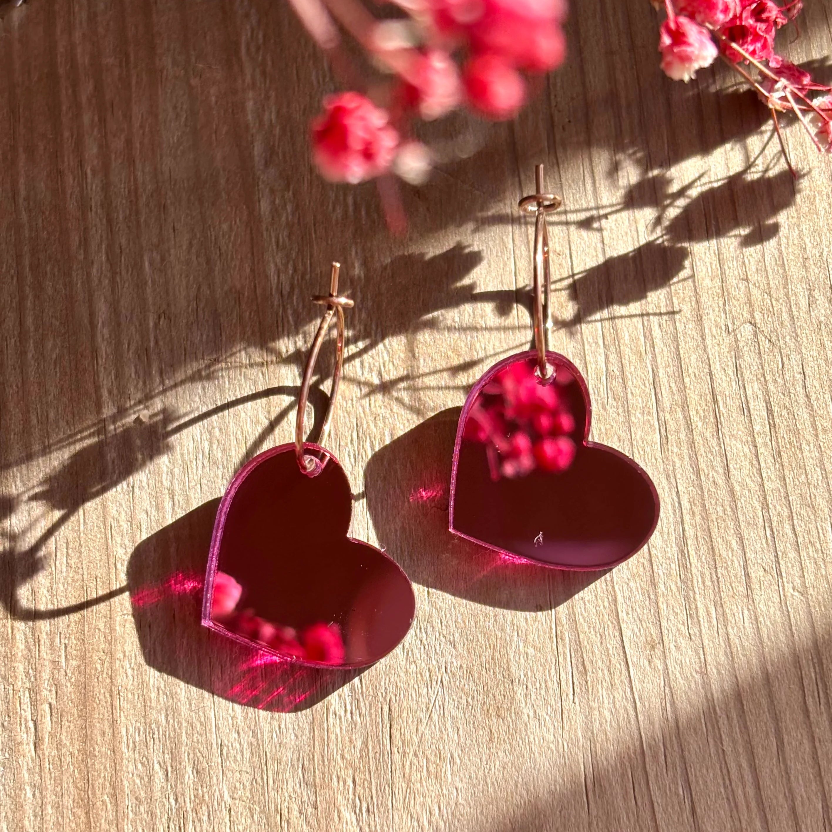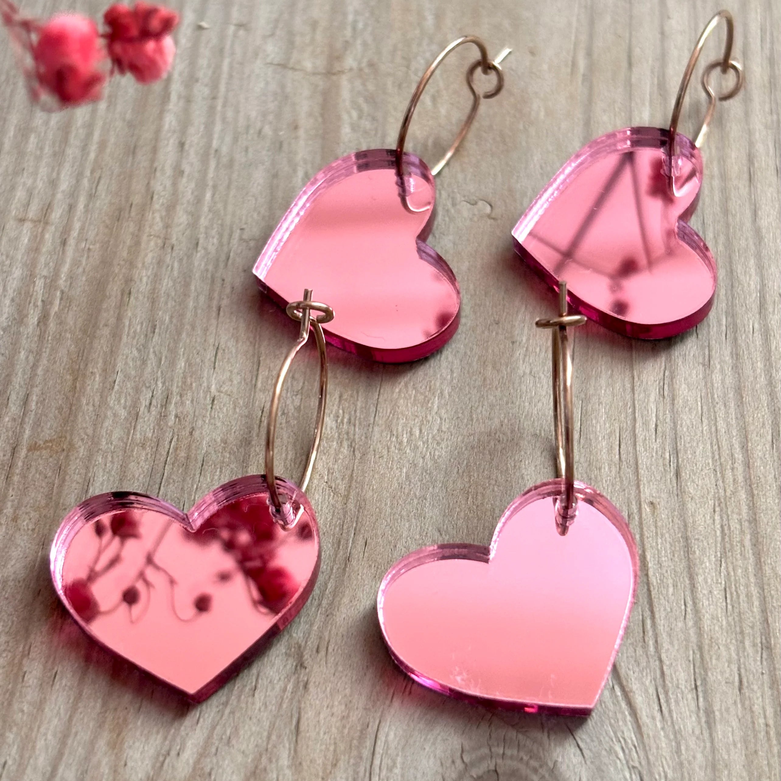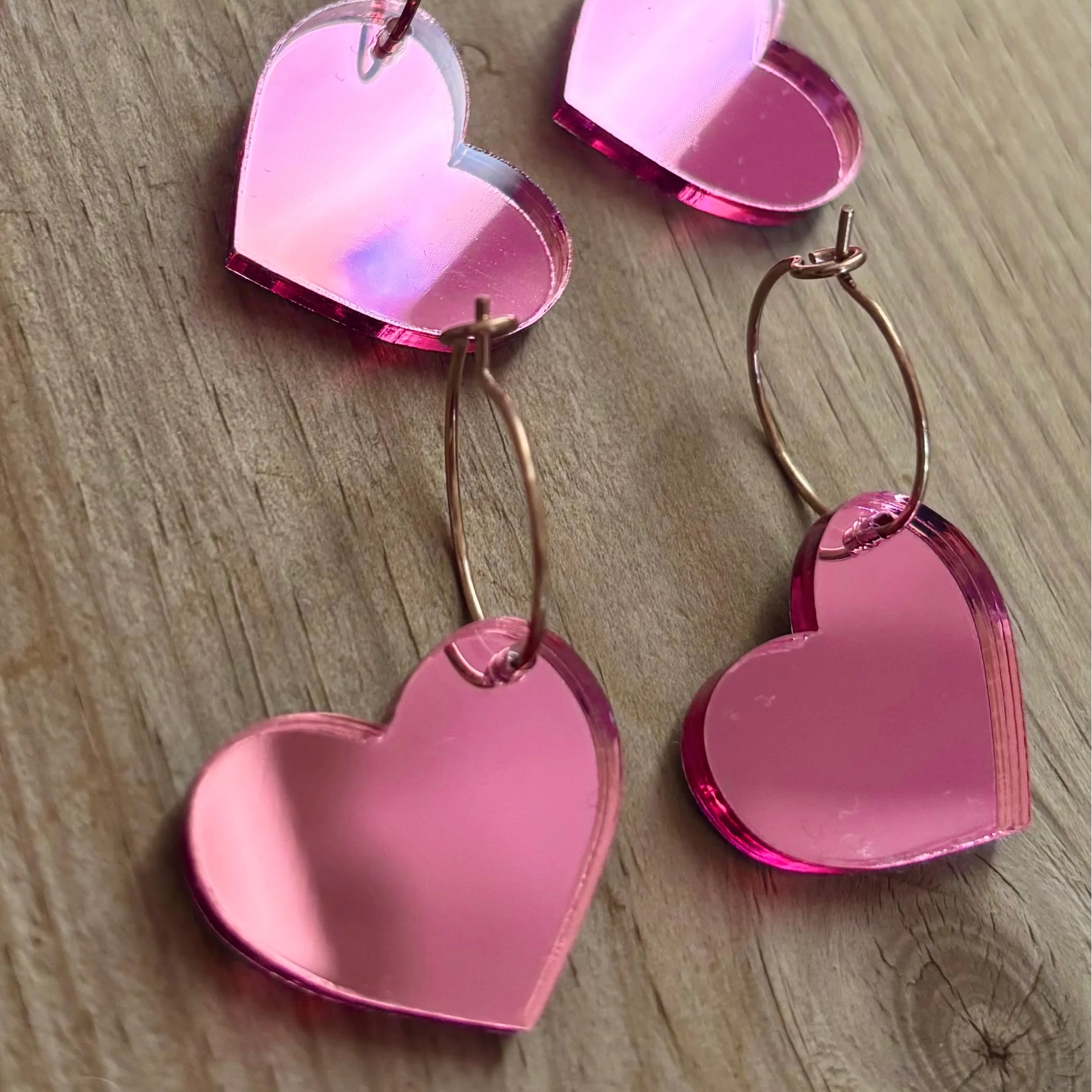 Eri valaistukissa erilailla kimaltelevat sydänkorvakorut on valmistettu laserleikatusta pinkistä peiliakryylista ja viimeistelty ruusukullatusta kirurginteräksestä valmistetuin renkain.