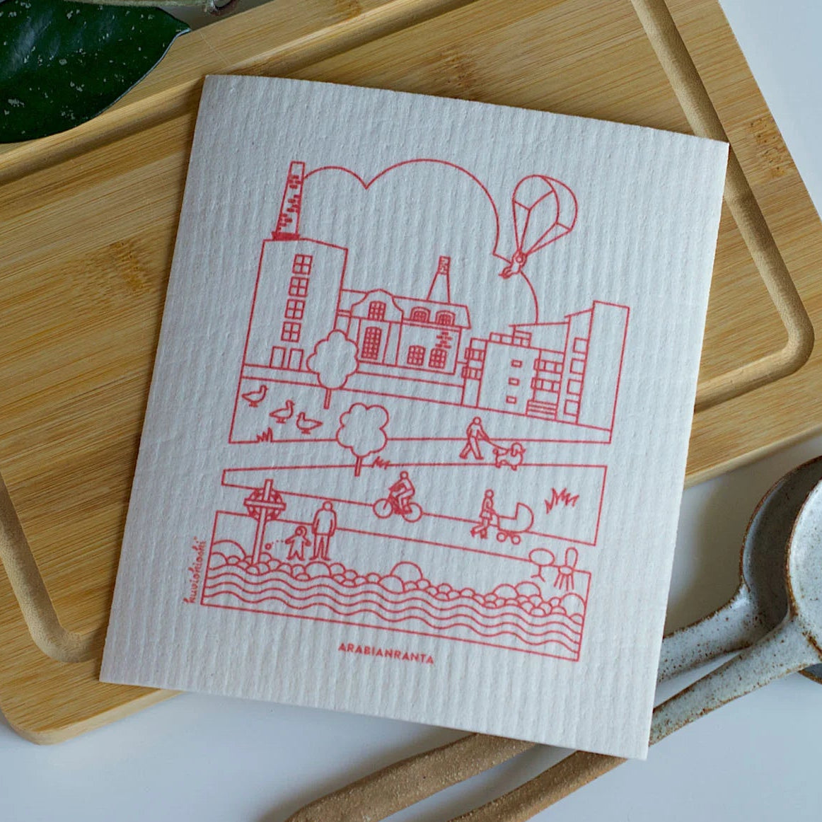 Kaunis ja käytännöllinen Kuviokioskin tiskirätti tuo ripauksen designia keittiöön! Kuvituksena Helsingin ikonisia maisemia tai tunnelmallinen Arabianranta – täydellinen lahja kaupungin ystävälle tai omaan kotiin.