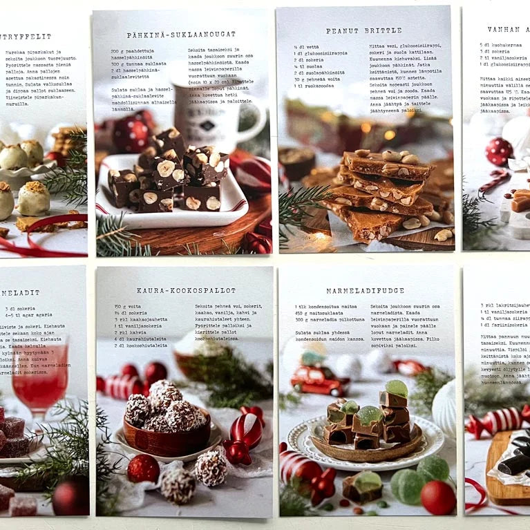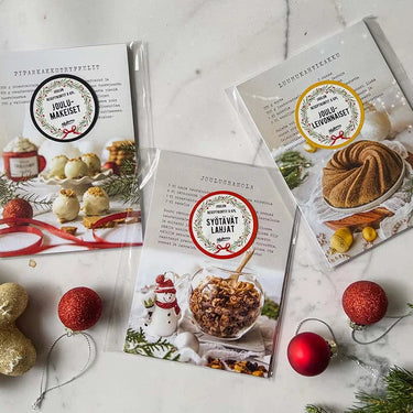 Makeaan reseptikorttipakat tuovat joulun herkut lähelle ja lahjat valmiiksi. Jokaisessa kortissa on helposti toteutettava resepti, joka sopii suoraan annettavaksi lahjaksi tai herkuteltavaksi itse. Mitäpä, jos hankkisit tarvikkeet valmiiksi tai valmistaisit itse herkut oheen ja lunastaisin maineesi vuoden parhaana lahjanantajana paketoimalla setin ystävälle tai sukulaiselle lahjaksi yhdessä reseptikortin kanssa 🎁
