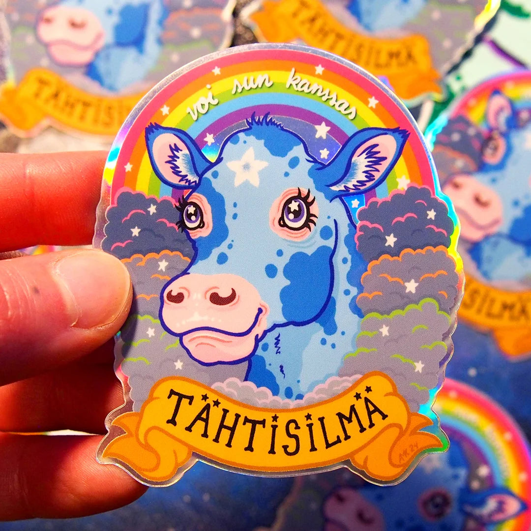 Satumainen Tähtisilmä -lehmä on liihotellut lähes kuuhun asti, kurkistellen veitikkamaisesti sadepilvien ja sateenkaaren lomasta. Tässä vinyylitarrassa on lisänä hempeää hologrammiefektiä, sekä itsensä taiteilijan äidin tiheään kylvämä lausahdus; ”voi sun kanssas, tähtisilmä!”