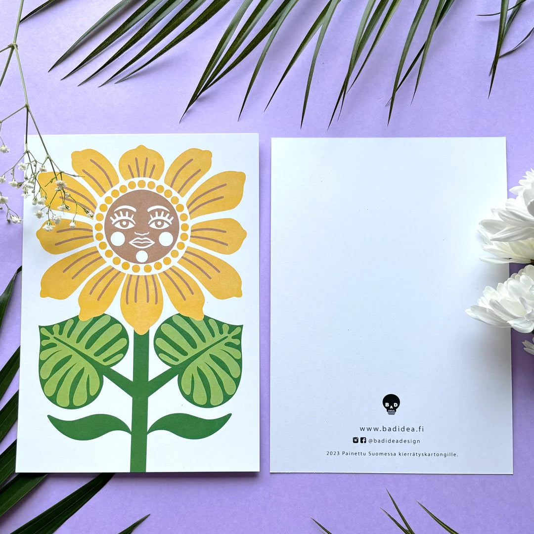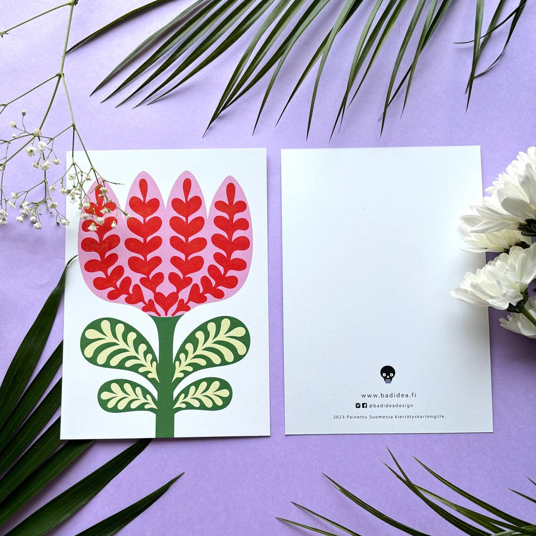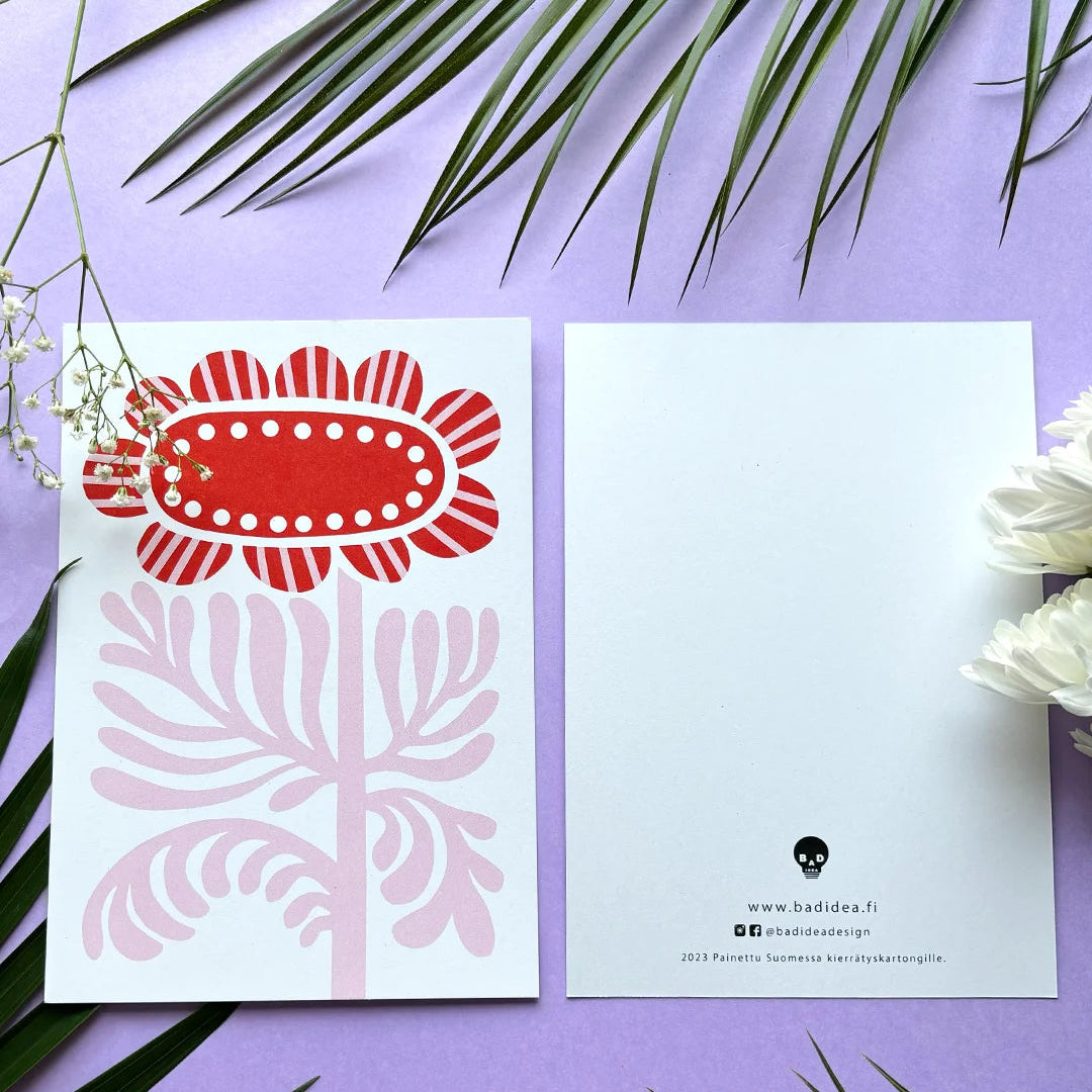 Suomessa suunnitellun ja painetun kortin takana on rivit vastaanottajan yhteystiedoille sekä tyhjää tilaa omille terveisillesi!