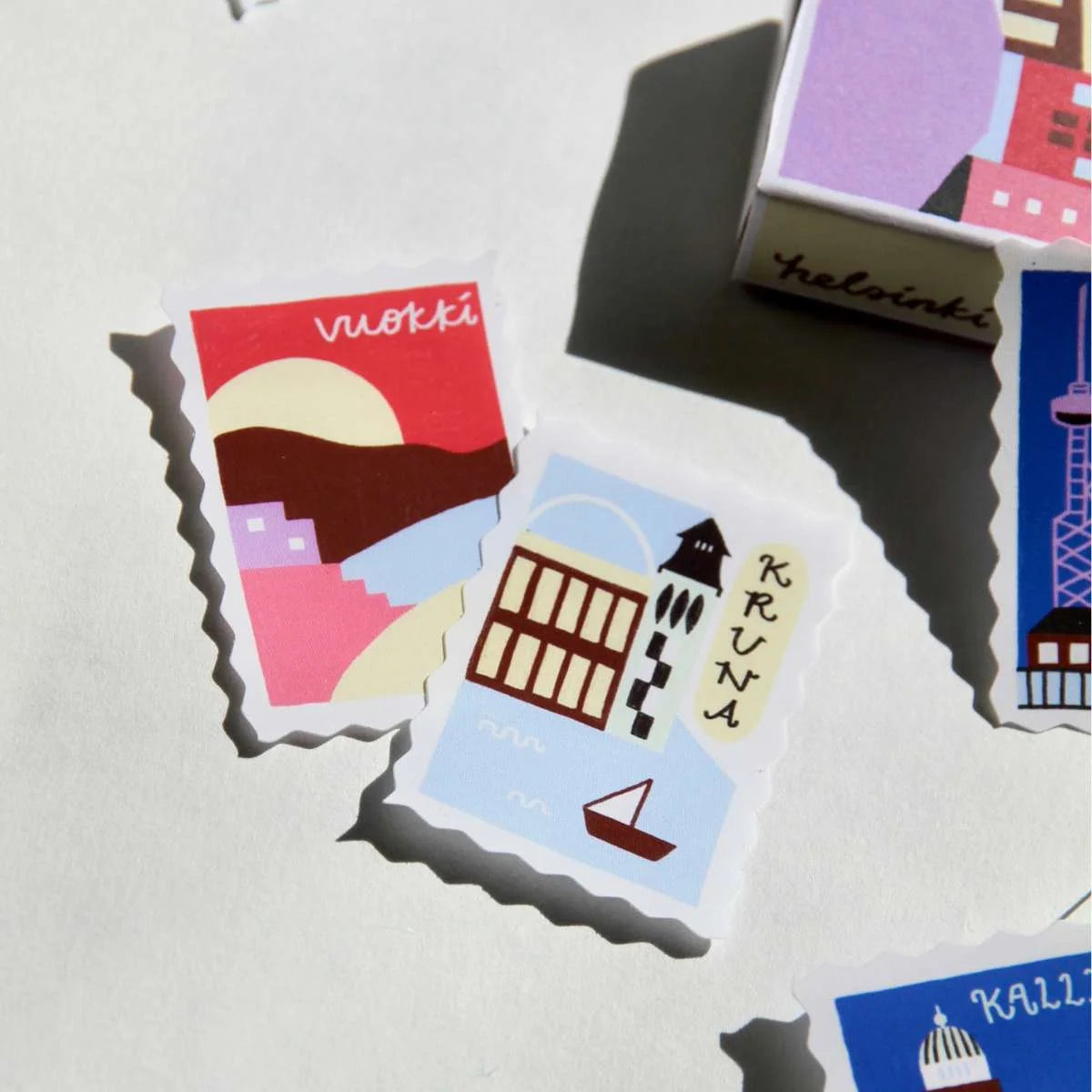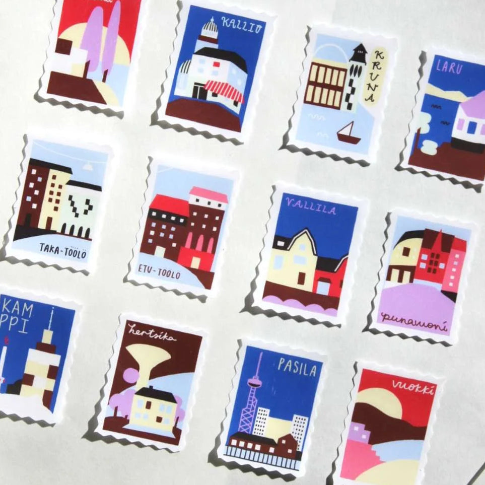 Staper Studion Helsinki Matchbox -tarrapaketti sisältää 12 kauniisti kuvitettua tarraa Helsingin legendaarisista kaupunginosista!
