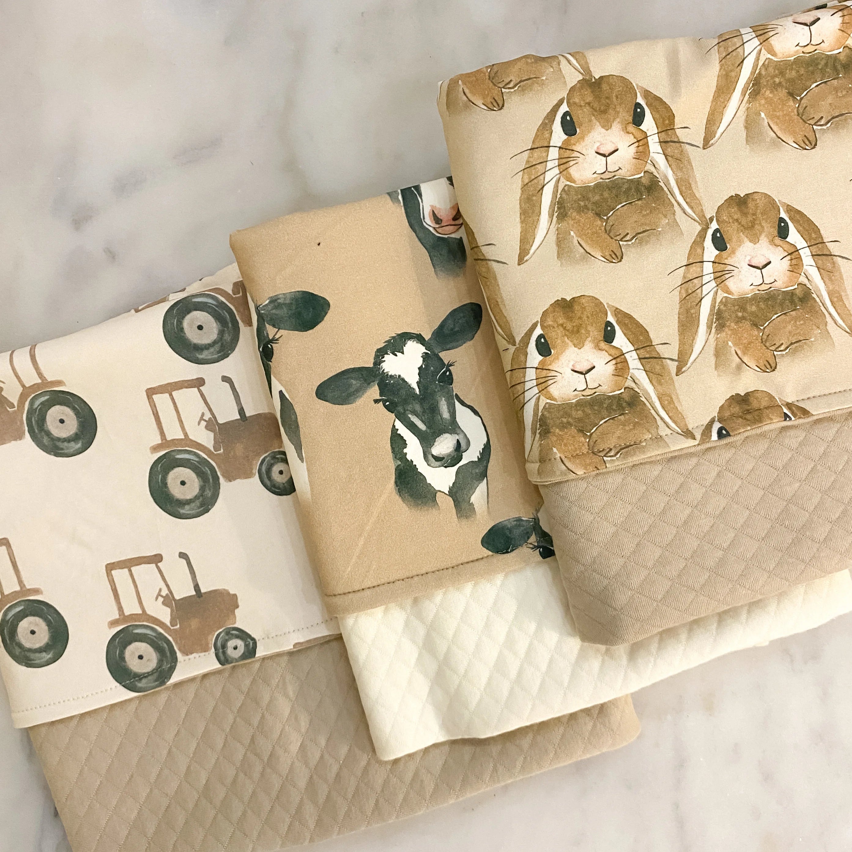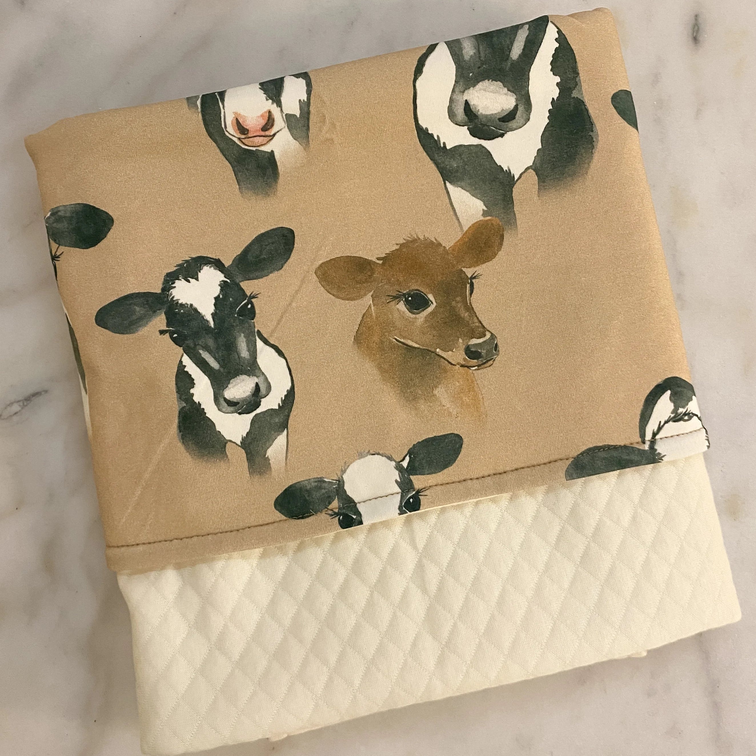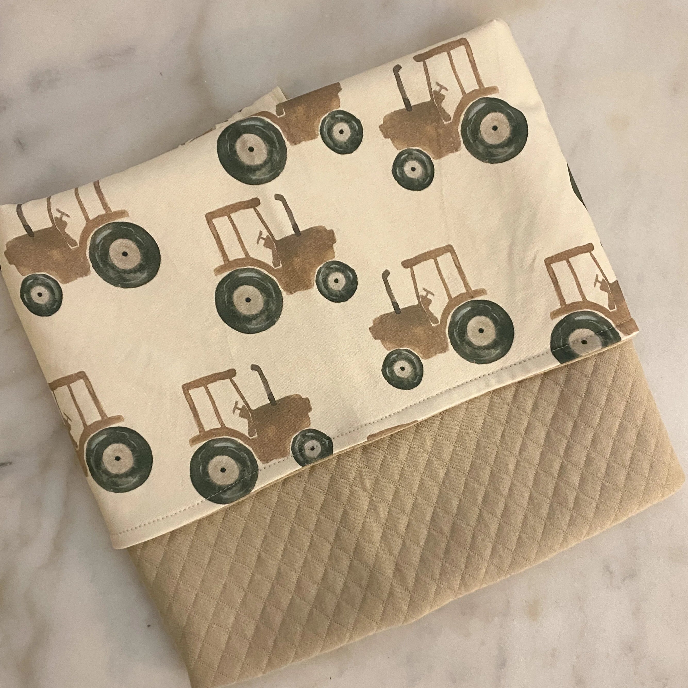 Toinen puoli on pehmeää trikoota kauniilla kuosilla, ja toinen puoli tikkicollegea ohuella vanutäytteellä – juuri sopivan lämmin mutta ei hiostava. Peitto on tarpeeksi kevyt mukana kuljetettavaksi, mutta silti mukavan suojaava esimerkiksi lattialla.