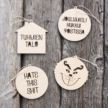 SunnyMore Designin antijoulukuusenkoristeet tuovat kuuseen asennetta, huumoria ja pienen annoksen kapinaa. Täydellinen lahja pikkujouluihin, kaverille jolla on oma huumorintaju… tai omalle kuuselle, jos tuntuu että se kaipaa vähän spicea.