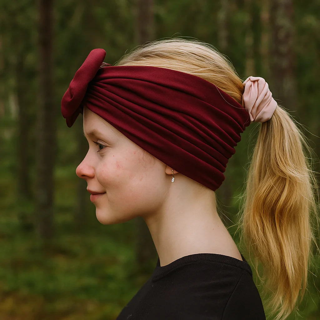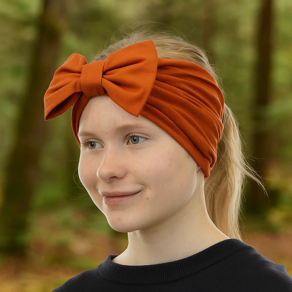 Little Mayan turbaanipanta irrotettavalla rusetilla on monikäyttöinen trikoinen panta aikuisen ja lapsen ulkoiluun!