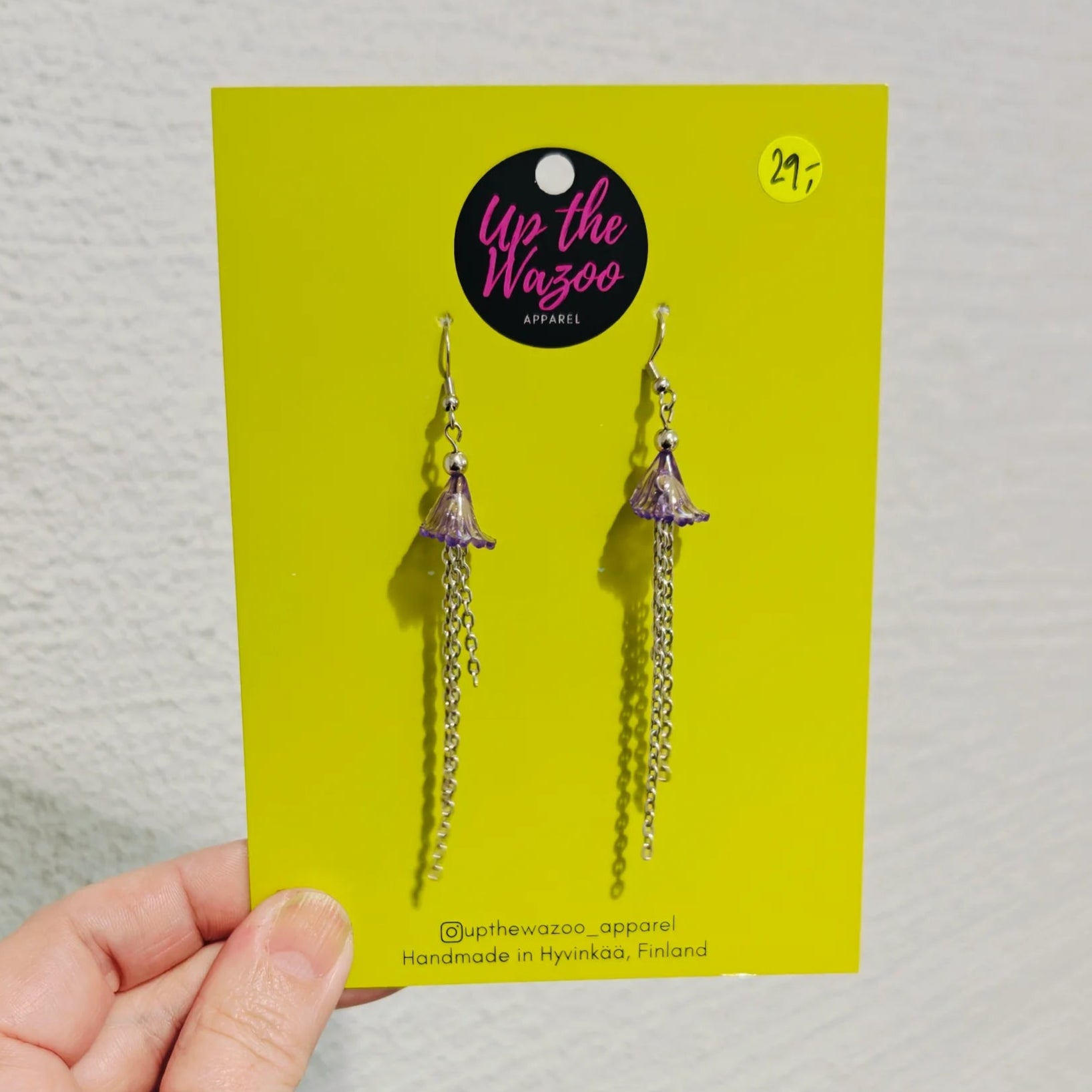 Bluebell -korvakorut ovat keveät, sirot mutta näyttävät – täydellinen yhdistelmä arkeen ja juhlaan. Korujen vaaleanlila kellokoriste antaa herkän ja romanttisen ilmeen, kun taas roikkuvat metalliketjut tuovat kokonaisuuteen ripauksen rohkeutta ja särmää.