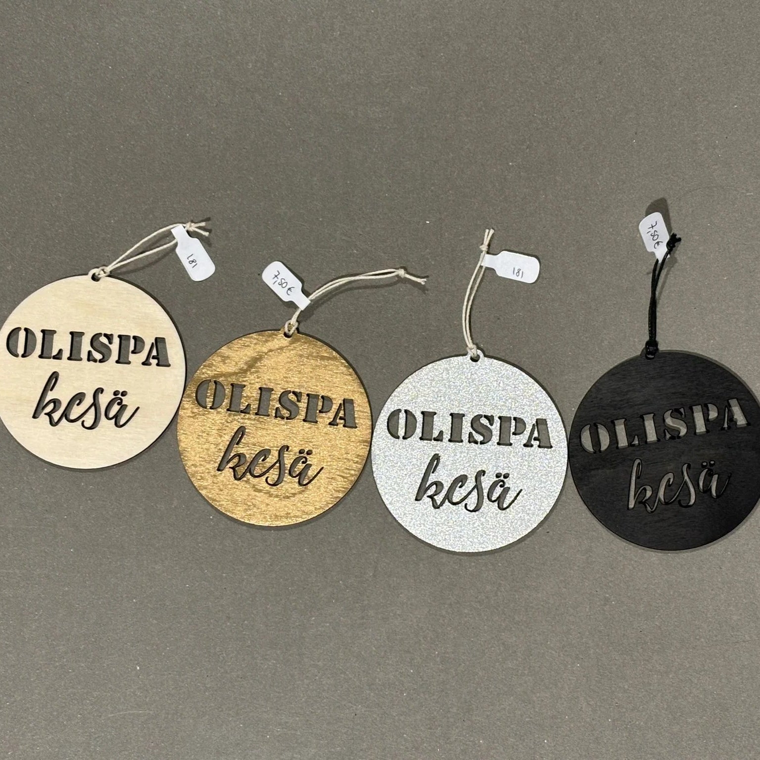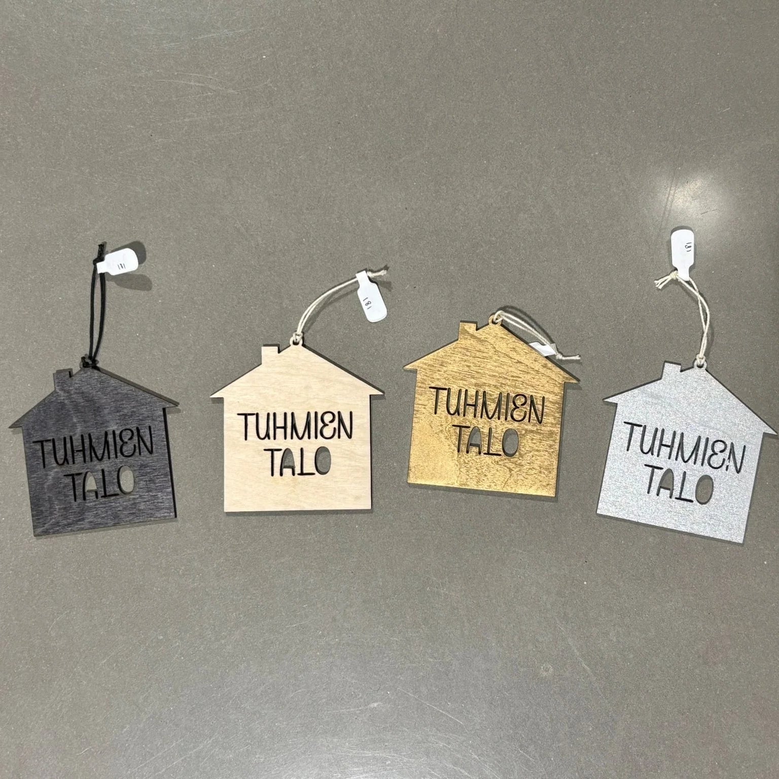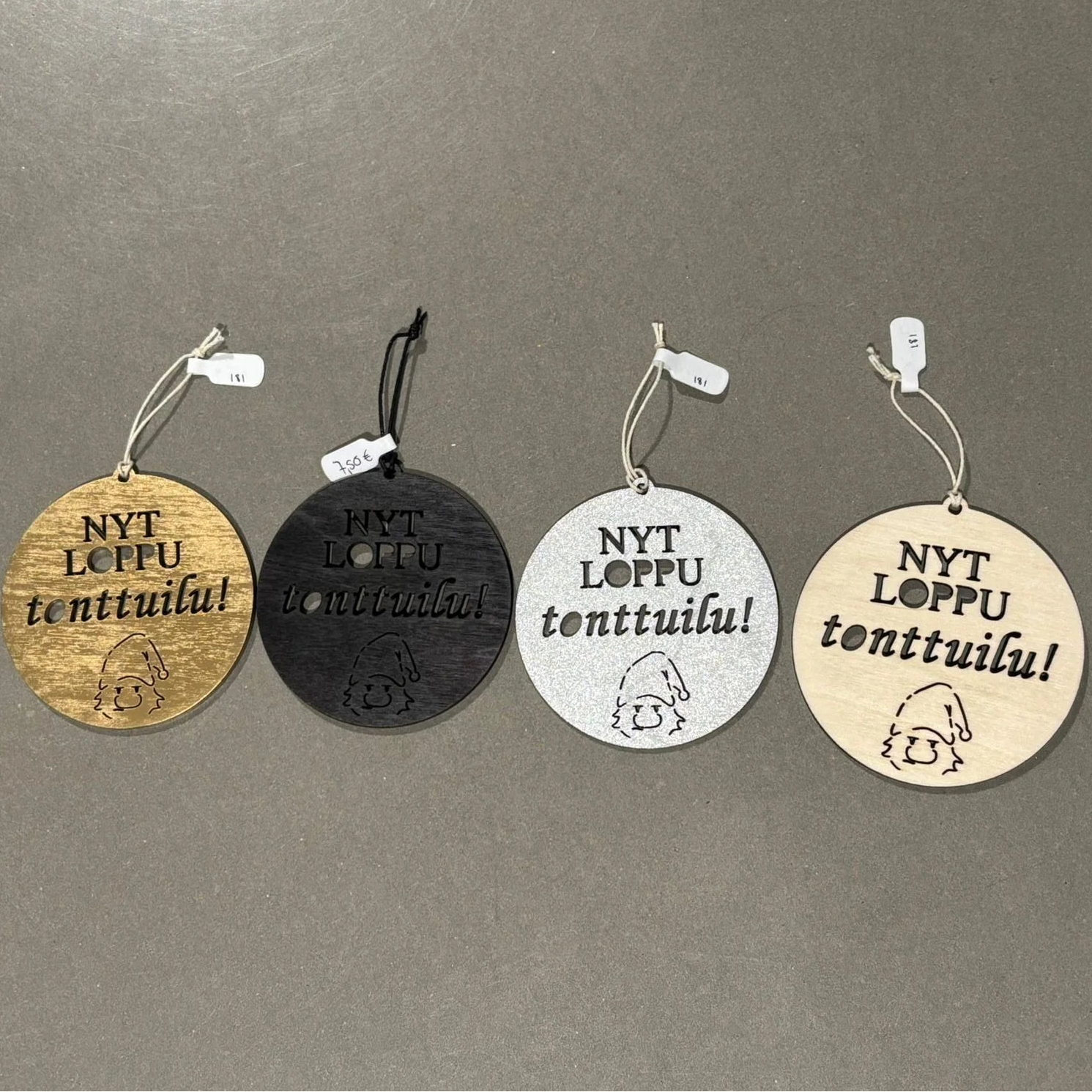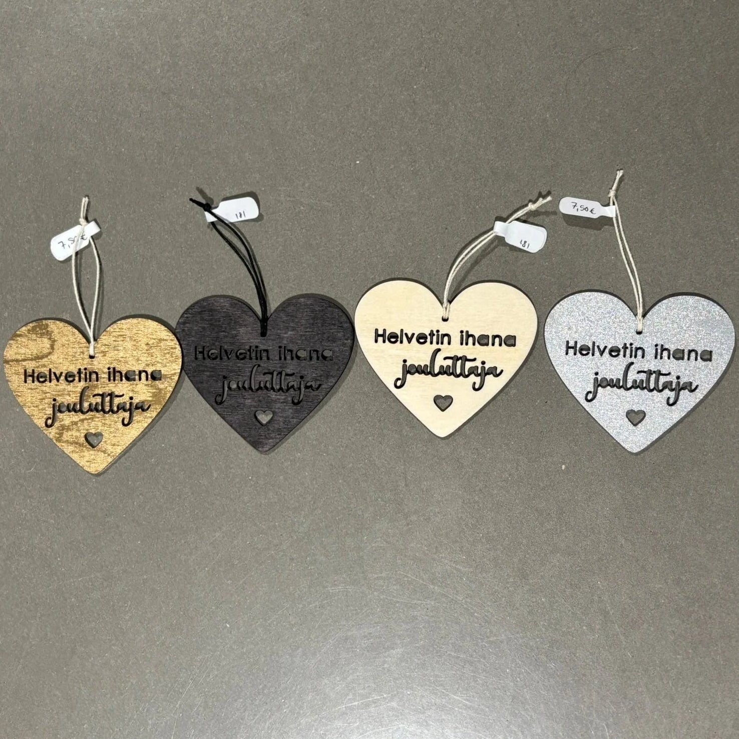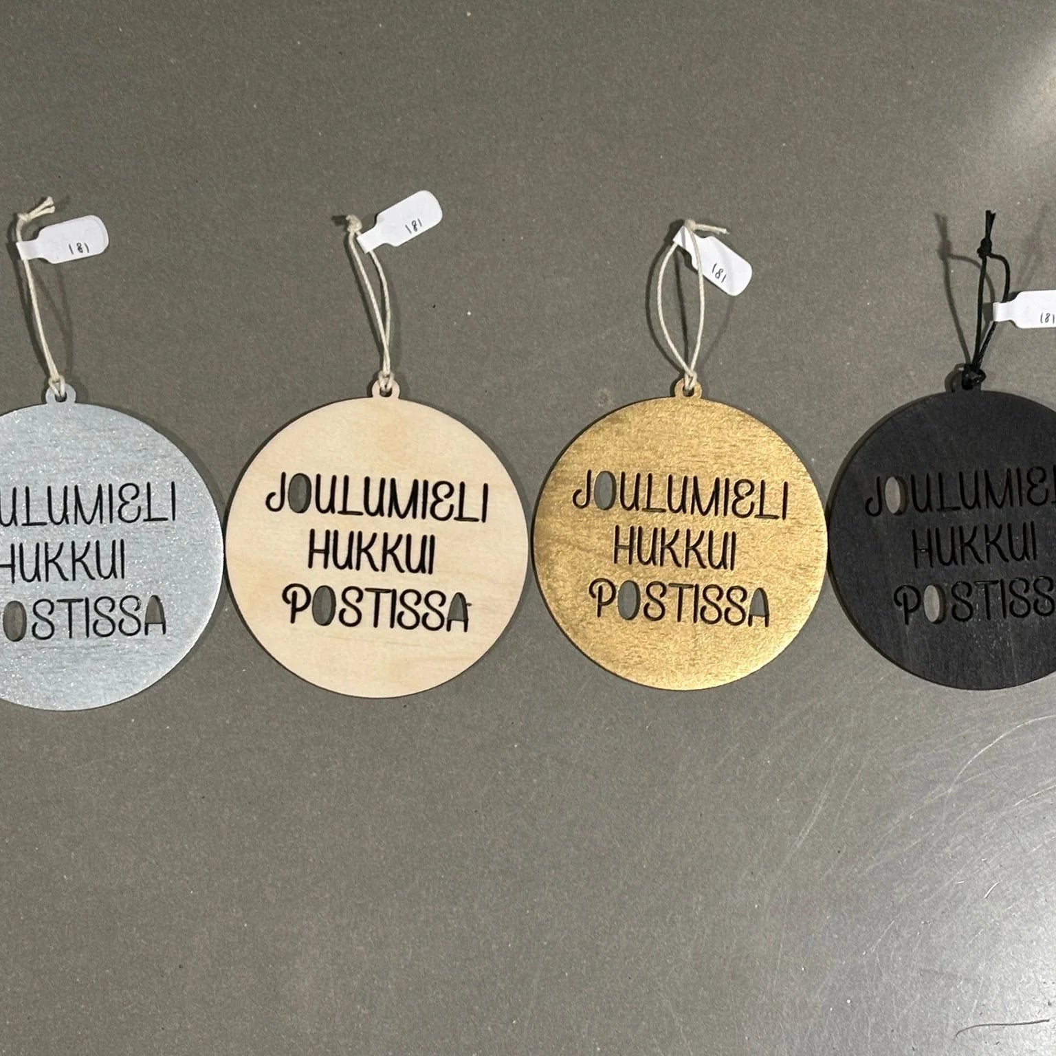 Ripustettavat joulukoristeet on valmistettu kestävästä, mutta kevyestä ohutviiluvanerista ja niissä on naru ripustamista tai paketin päälle solmimista varten.
