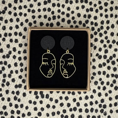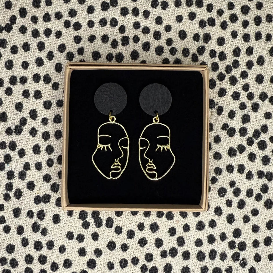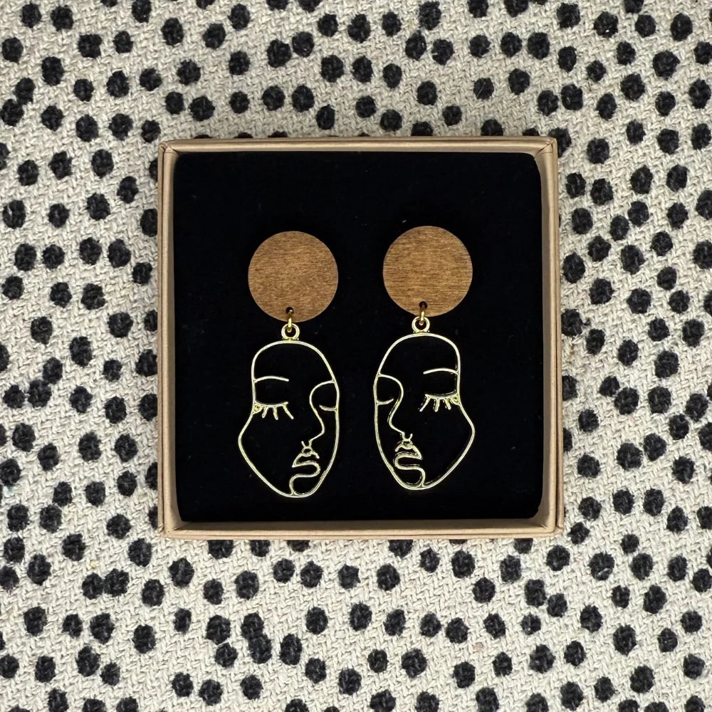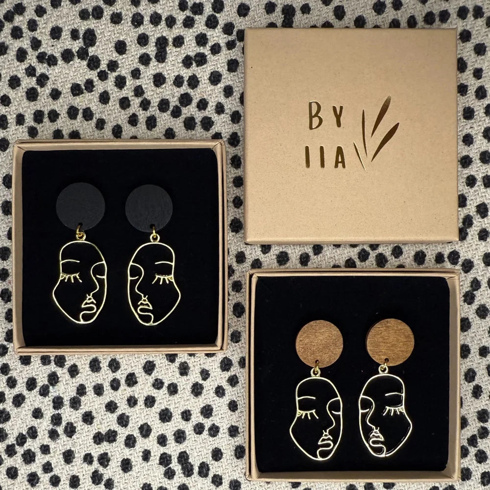By Iian modernin taiteelliset Aira Naisen Ääriviivat -korvakorut yhdistävät puun luonnollisen pehmeyden ja kullanvärisen metallin graafisen keveyden. Puinen nappiosa luo lämpimän kontrastin, josta roikkuva kasvojen ääriviivoja muistuttava riipus tekee kokonaisuudesta modernin ja taiteellisen.