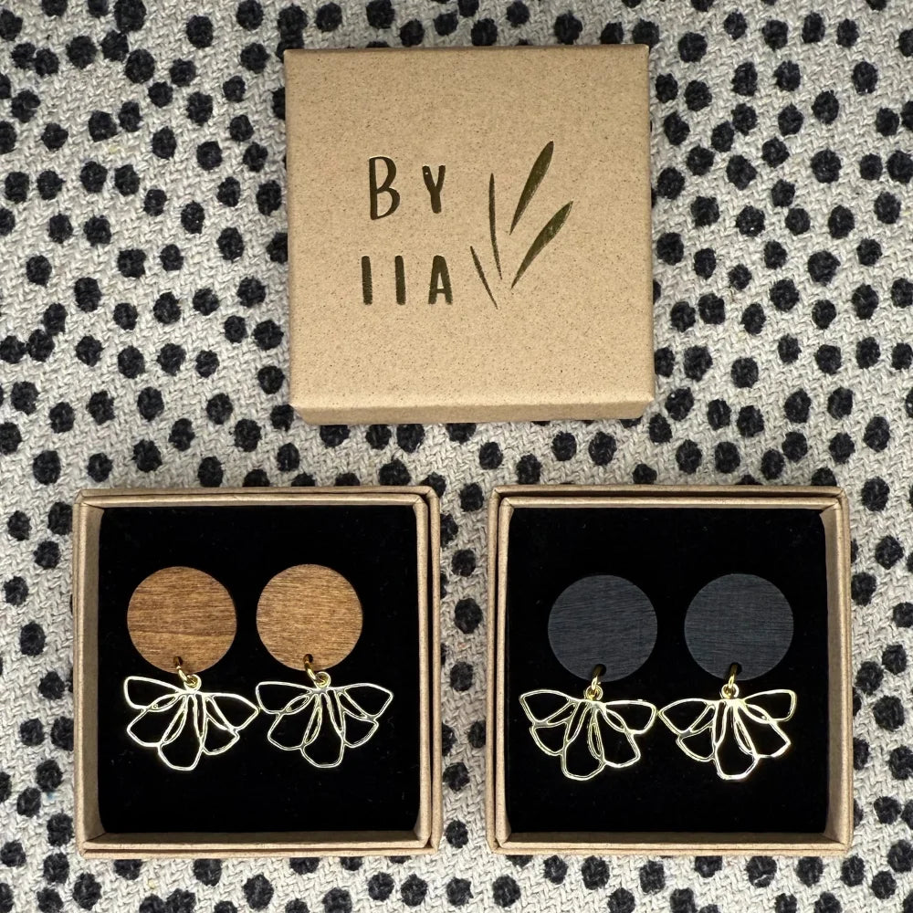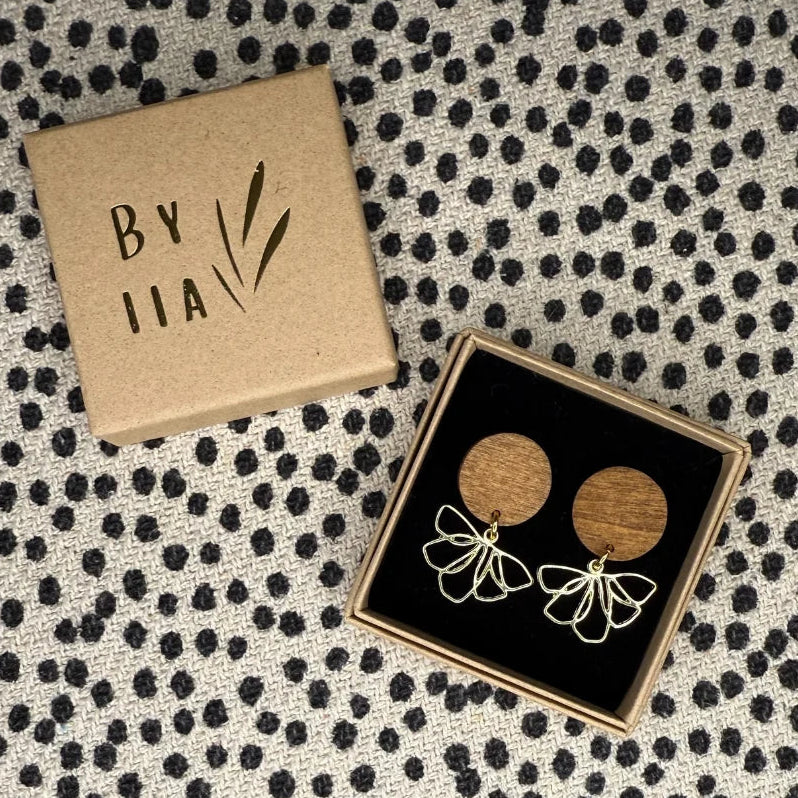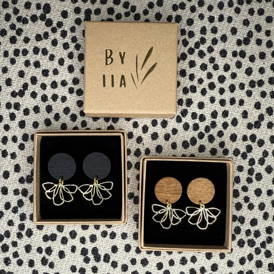 By Iian siron kauniit kotimaiset Silja -korvakorut yhdistävät puun luonnollisuuden ja kukkamaisen viuhkariipuksen elegantin kauneuden!