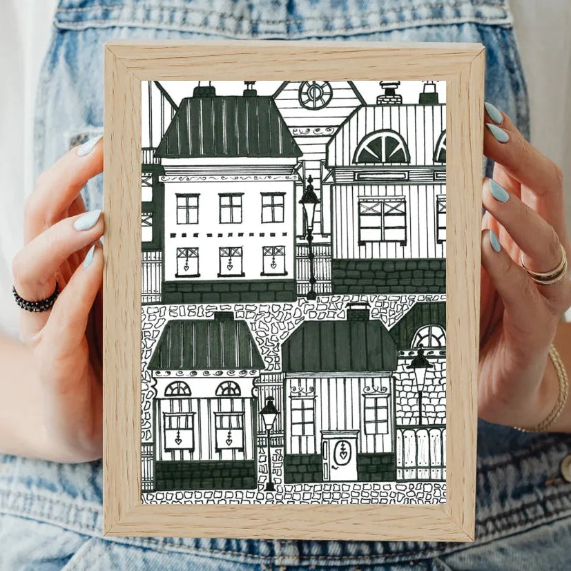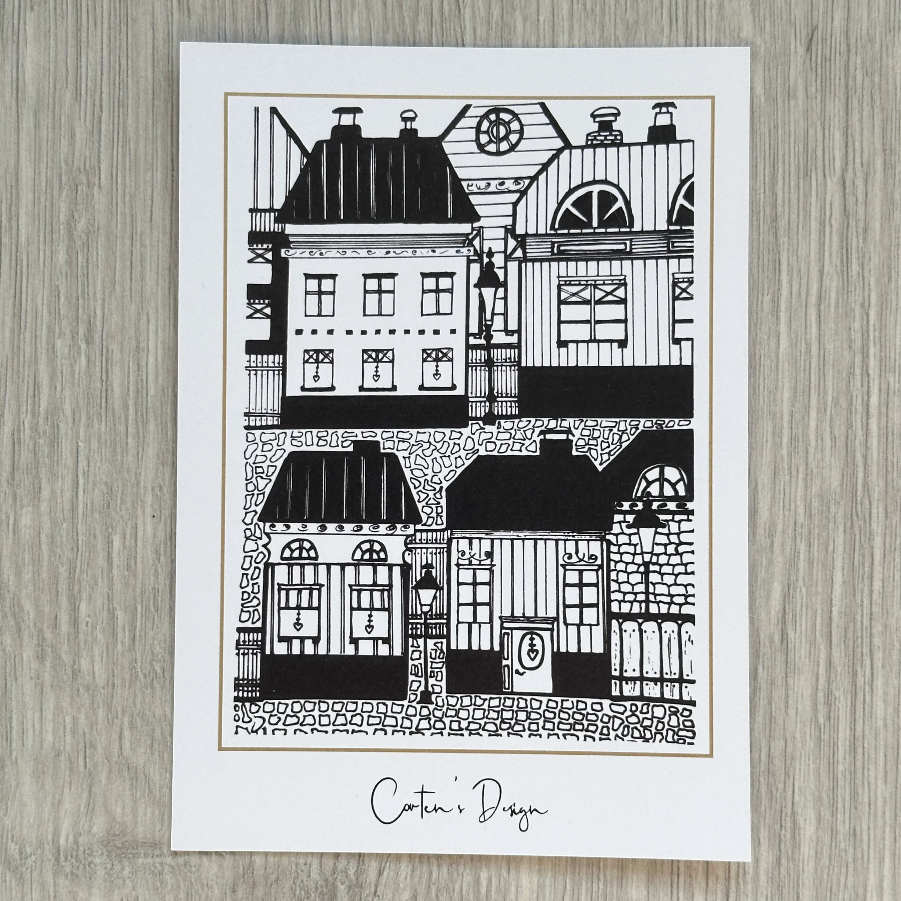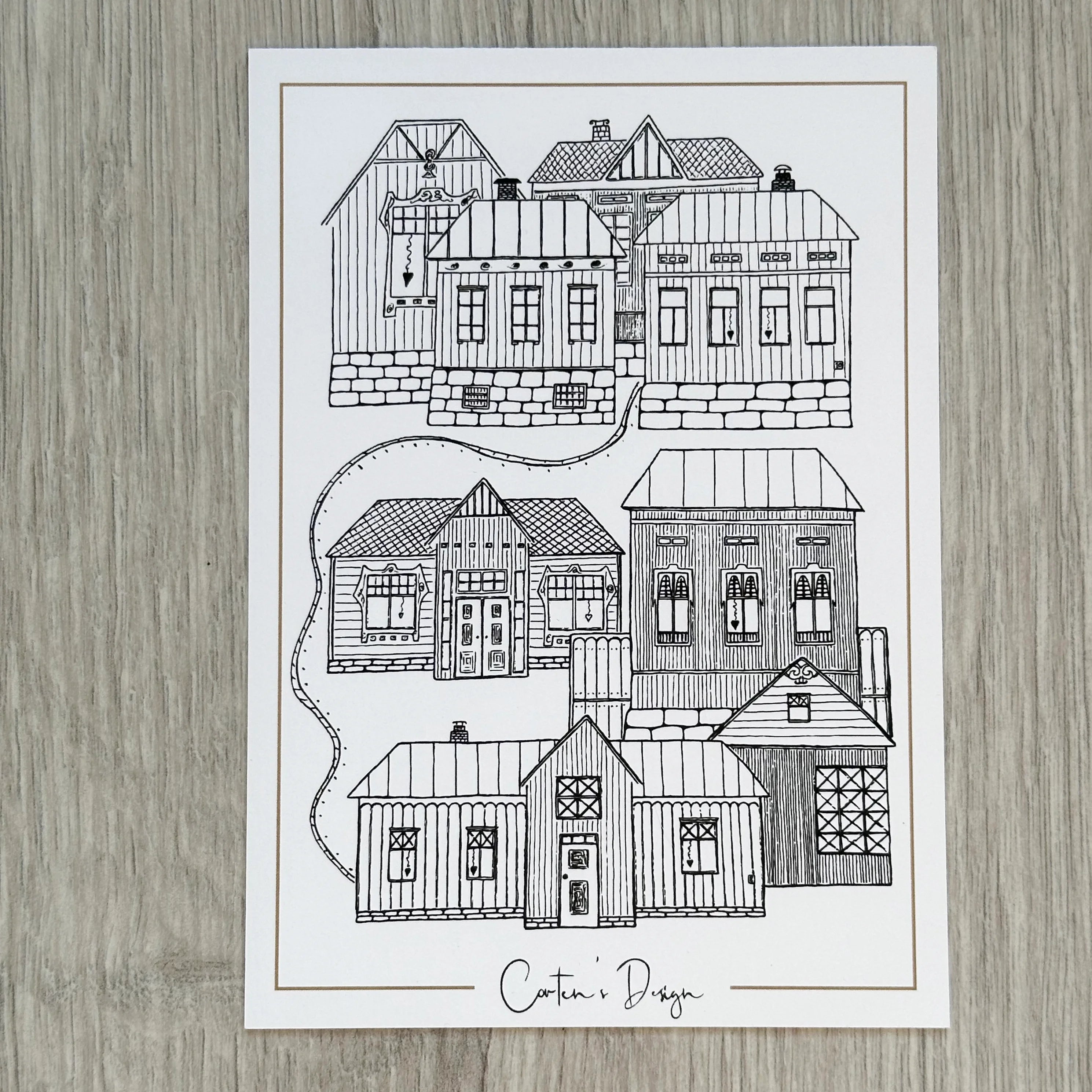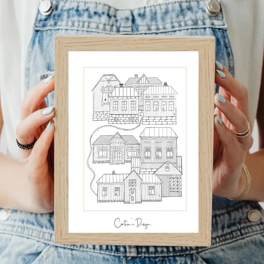 Cortens Designin taidekorttien kuvat pohjautuvat tussipiirroksiin, joiden inspiraation lähteinä on vanhat suomalaiset talot!