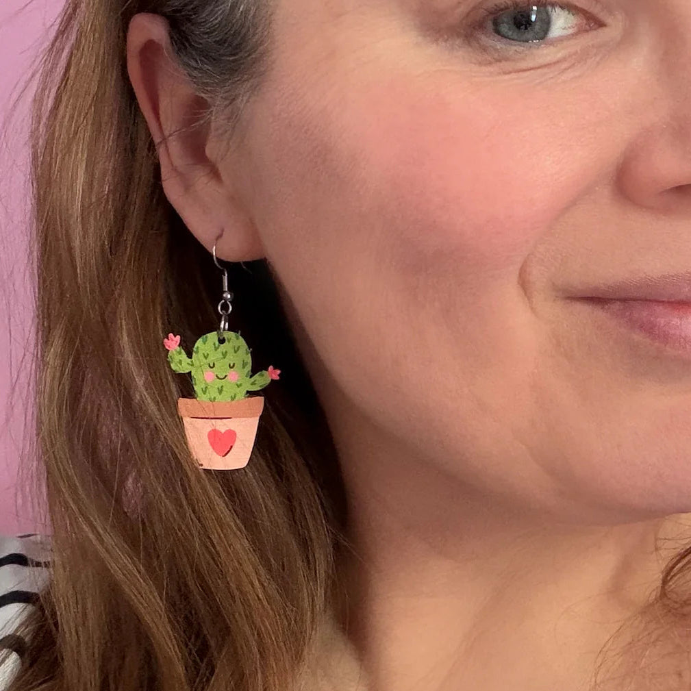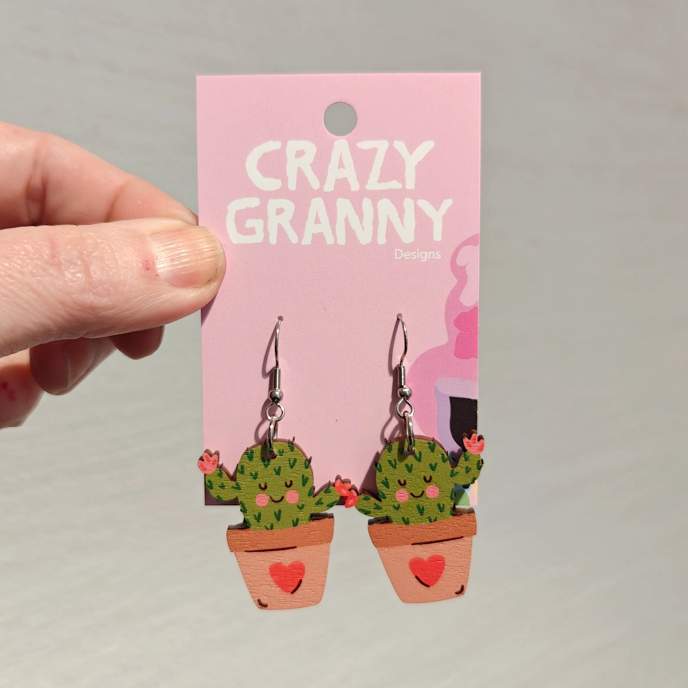 Crazy Granny Designsin suloiset koivuvaneriset Happy Cactus -korvakorut ovat täydellinen yhdistelmä leikkisyyttä ja persoonallista designia!