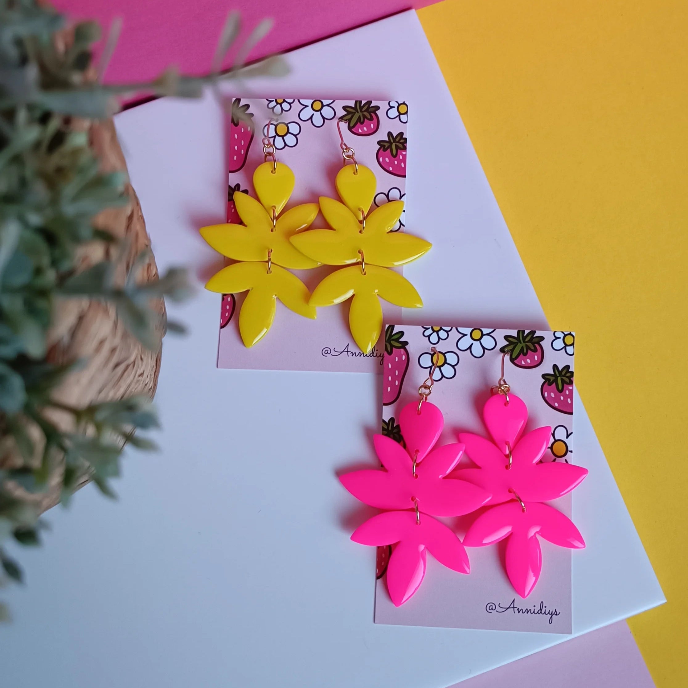 Annidiys Helinä -korvakorut tuovat päivään iloa, väriä ja energistä ilmettä. Näyttävän kokoiset, mutta kevyet korvakorut hurmaavat raikkailla sävyillään – valittavanasi pinkit tai keltaiset korvakorut, jotka piristävät asukokonaisuuden hetkessä.