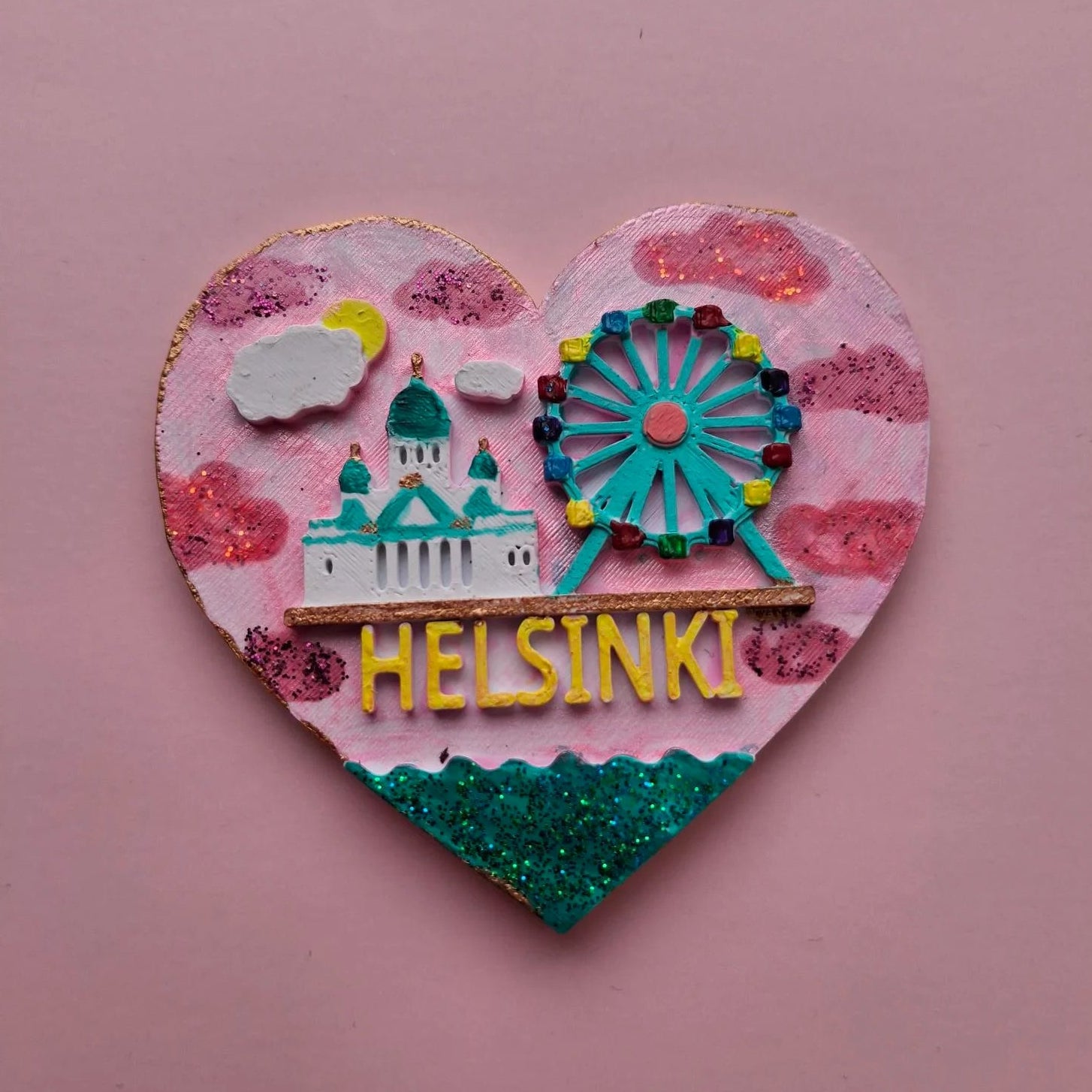 Katjataiteen Huomenta Helsinki -magneetti sydämen muotoinen, kimaltava pieni rakkaudentunnustus Helsingille 💗