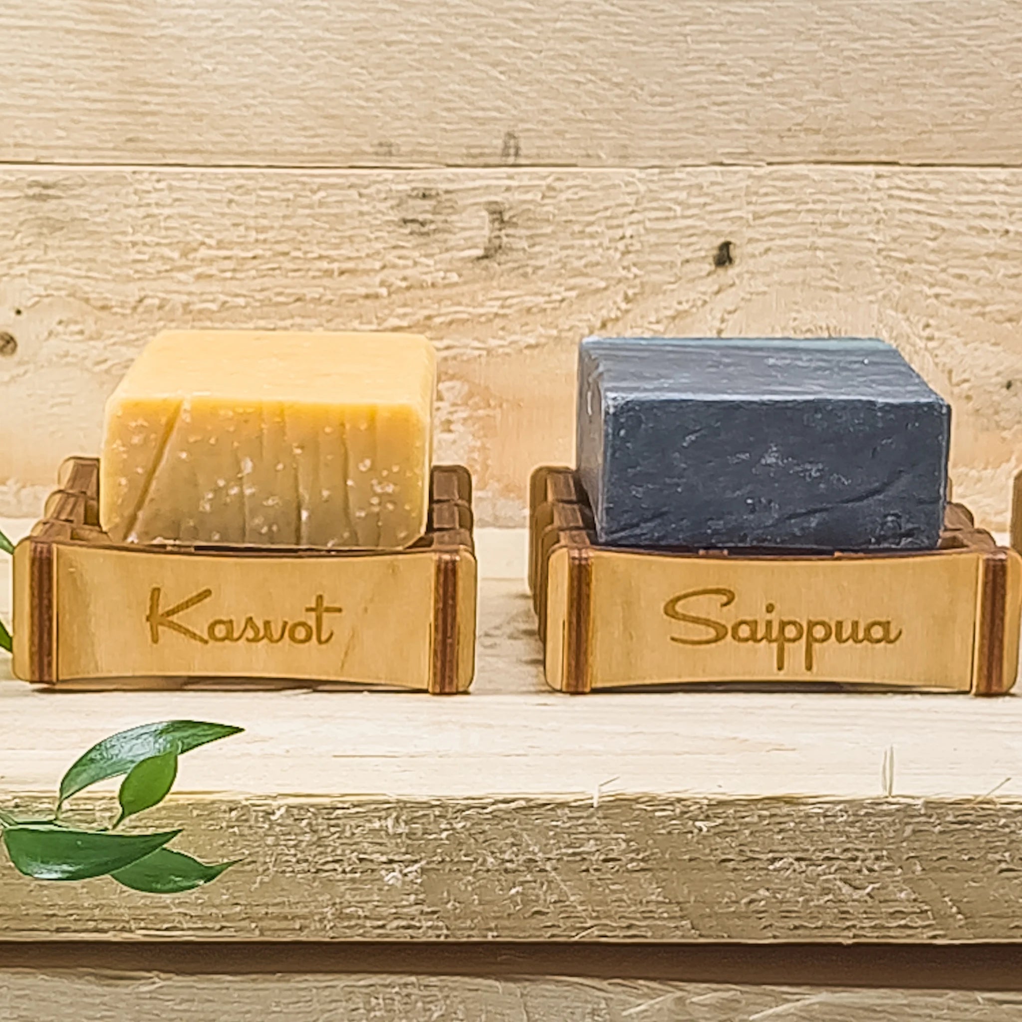 Petronella Designin koivuvanerinen saippua-alunen on käytännöllinen ja oivaltava ratkaisu palasaippuoiden, palashampoiden ja muiden palatuotteiden säilytykseen. Tekstillä varustettu saippua-alunen auttaa pitämään jokaisen saippuan omalla paikallaan – olipa kyseessä kasvosaippua, käsisaippua, keittiösaippua tai hoitoainepala.