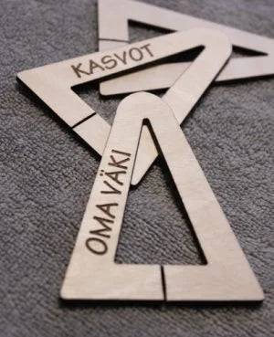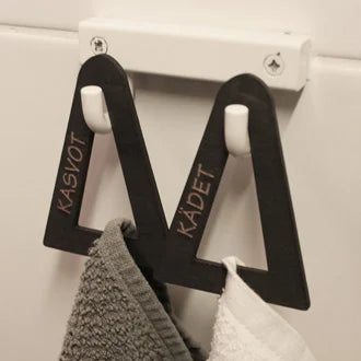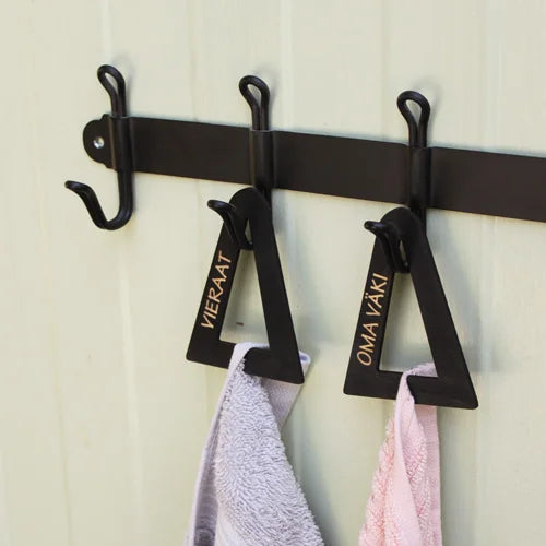 Ripustin toimii ilman klipsiä: pyyhe kiinnitetään helposti sujauttamalla sen kulma kolmion raosta. Joustava koivuvaneri kestää kevyttä taivutusta, joten rakoa voi tarvittaessa hieman suurentaa, jotta pyyhkeen asettaminen on entistä helpompaa.