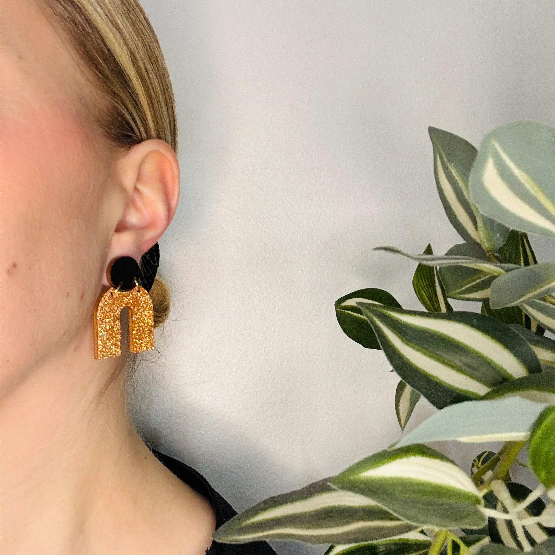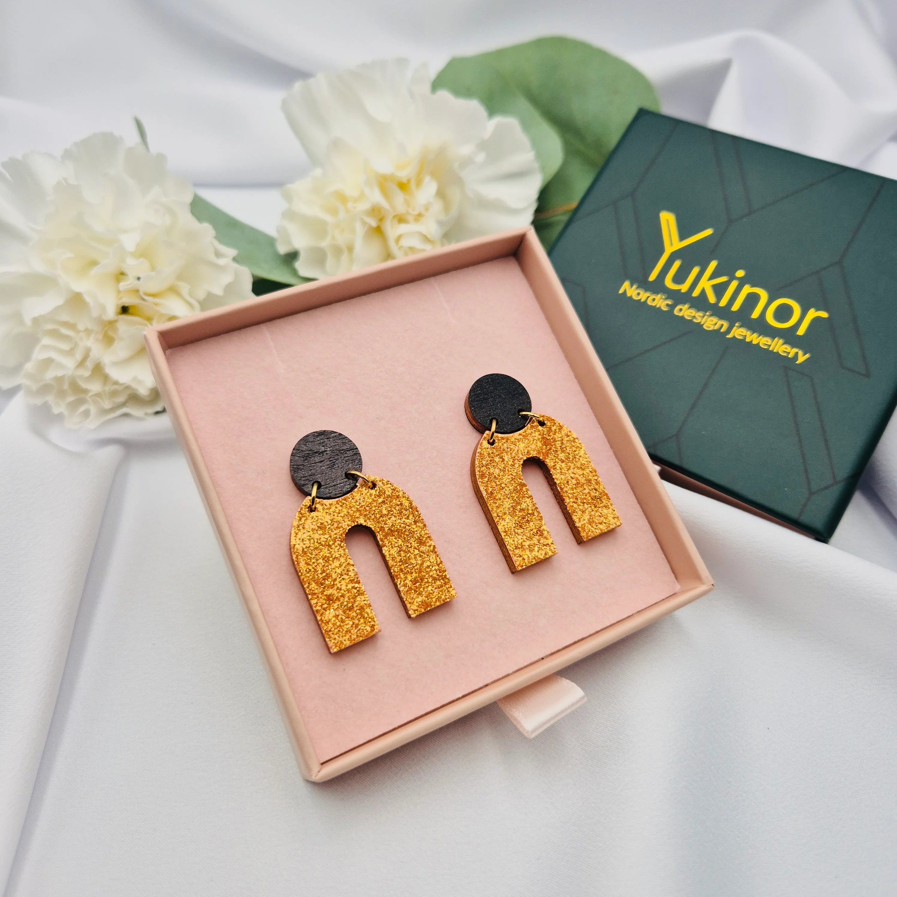 Yukinorin klassisen kauniit Kouki -korvakorut ovat tyylikäs yhdistelmä luonnollista koivuvaneria ja juhlavaa glitteriä tai modernia peiliakryyliä!