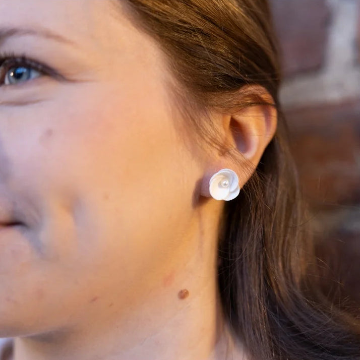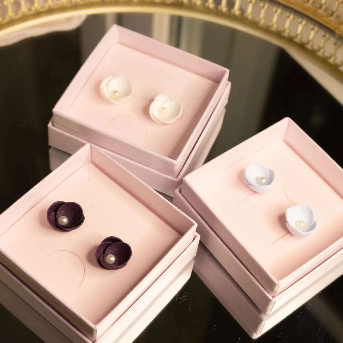 Kukat on muotoiltu käsin kevyestä materiaalista, minkä ansiosta korvakorut tuntuvat miellyttäviltä käytössä koko päivän. Allergisoimattomasta kirurginteräksestä valmistetut osat tekevät koruista turvalliset myös herkkäihoisille. Keskellä oleva akryylihelmi tuo koruihin hienovaraista hohtoa ja viimeistelee ilmeen.