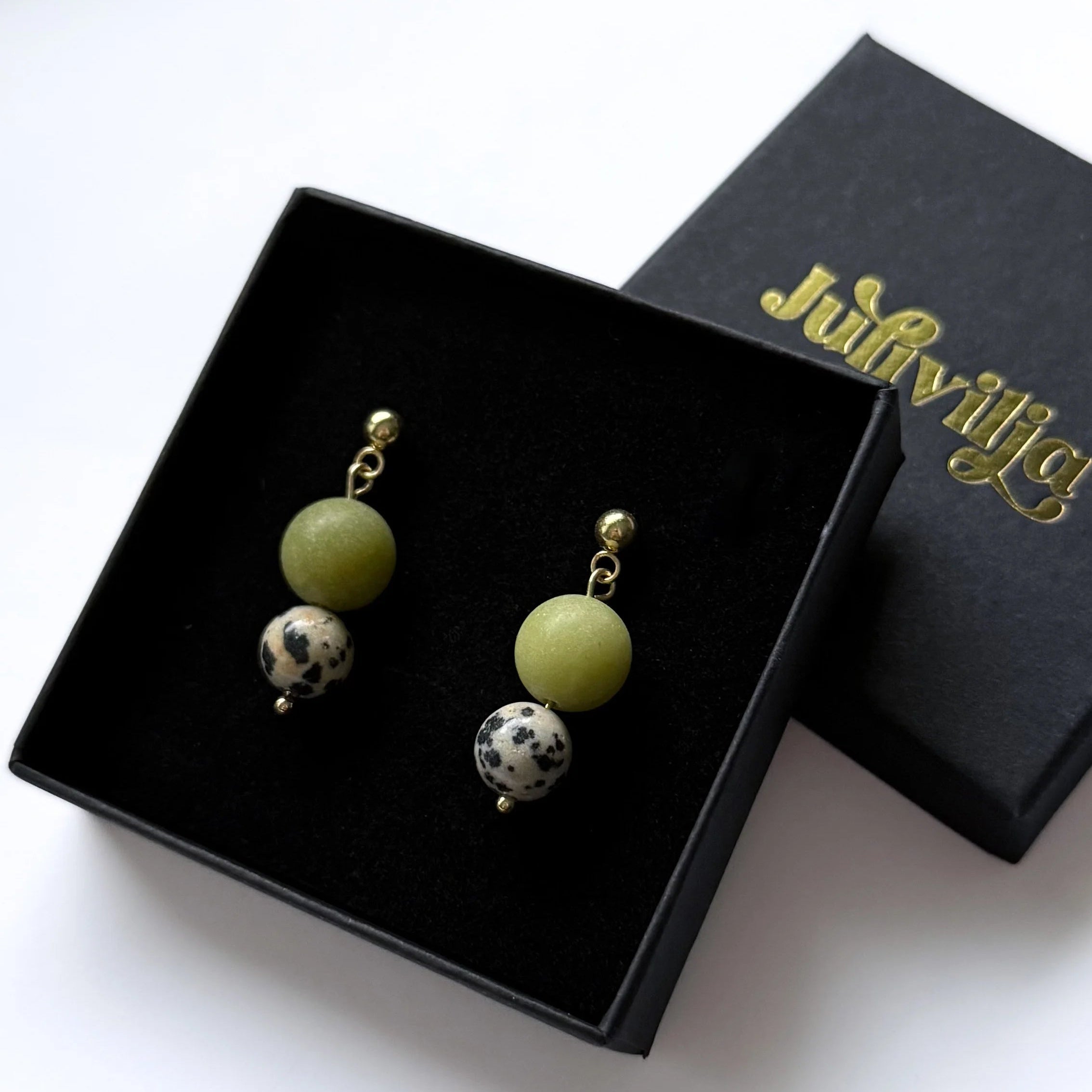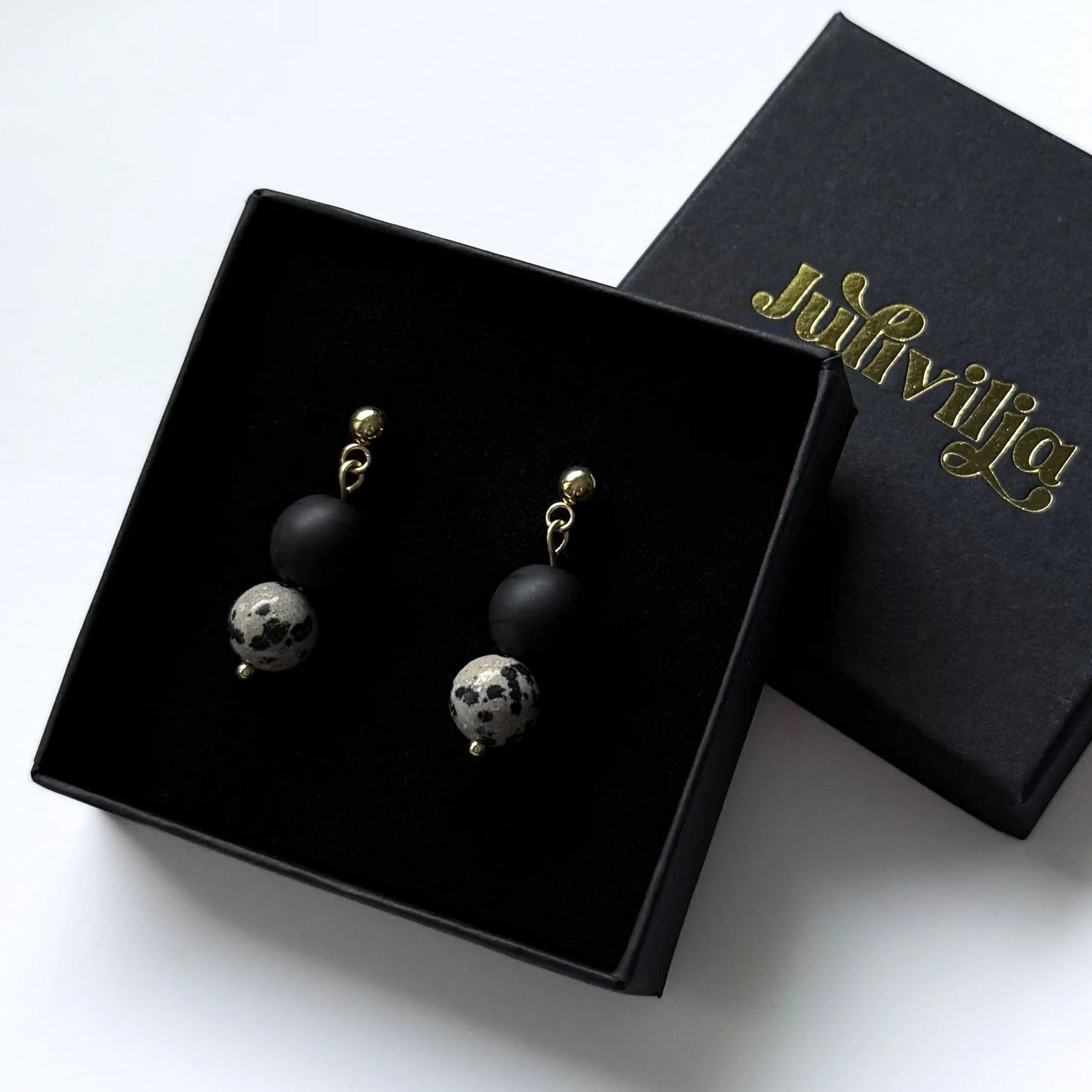 Juliviljan kauniissa kivihelmikorviksissa yhdistyvät rauhallinen mattapintainen kivihelmi ja leikkisä pilkullinen dalmatian jaspis!