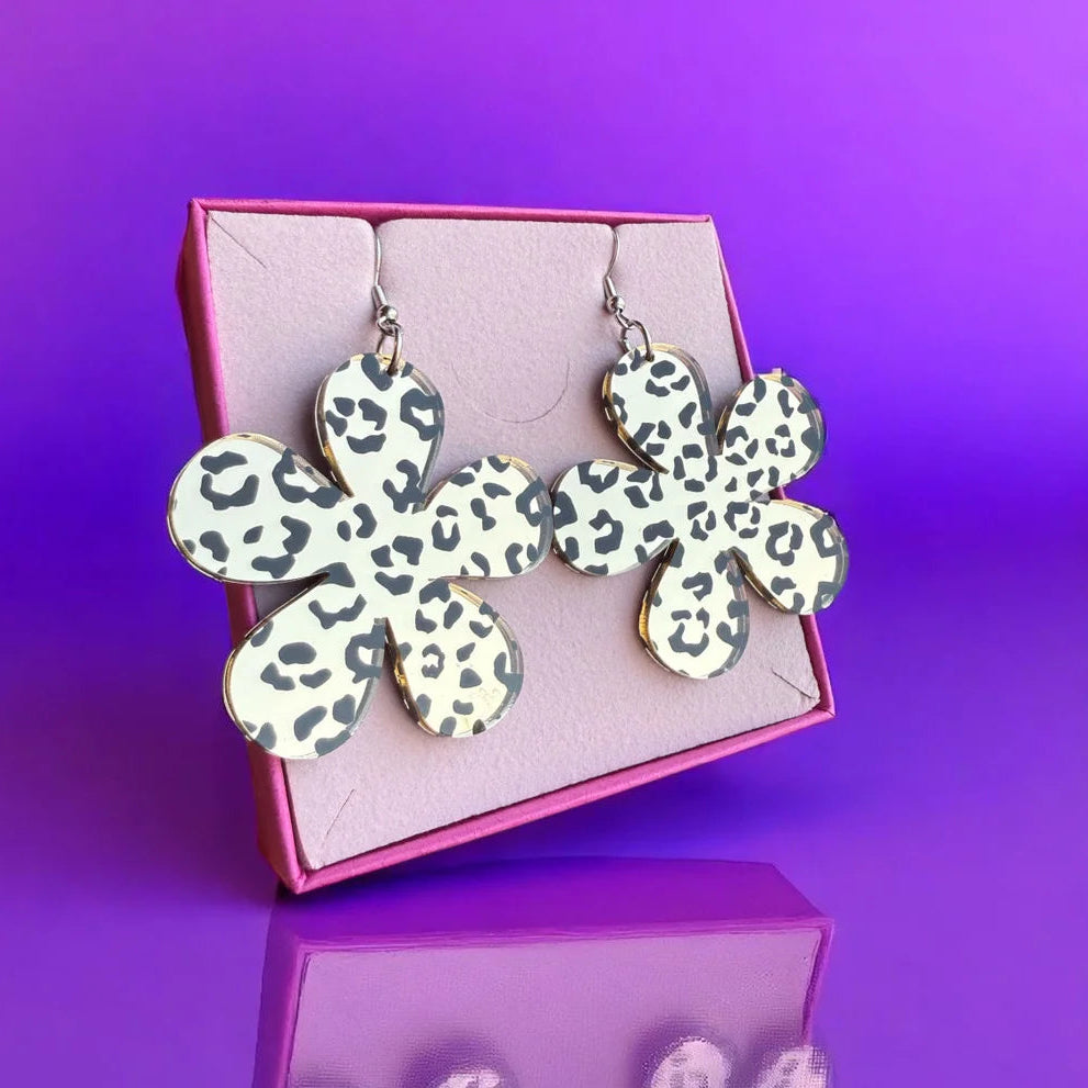 Qujeileva Designin näyttävän leikkisät Megakukka -korvakorut on valmistettu kevyestä leopardikuosisesta peiliakryylistä!