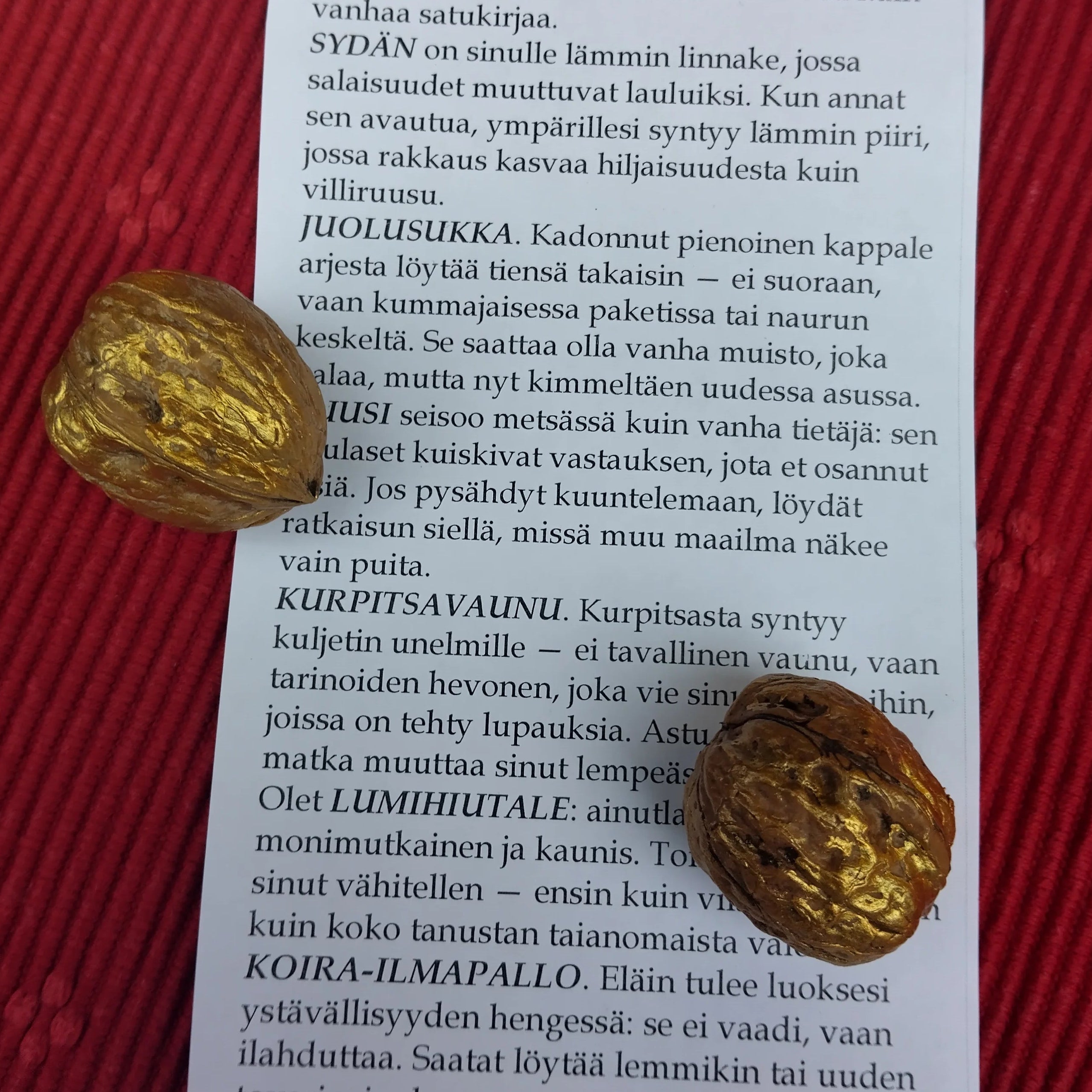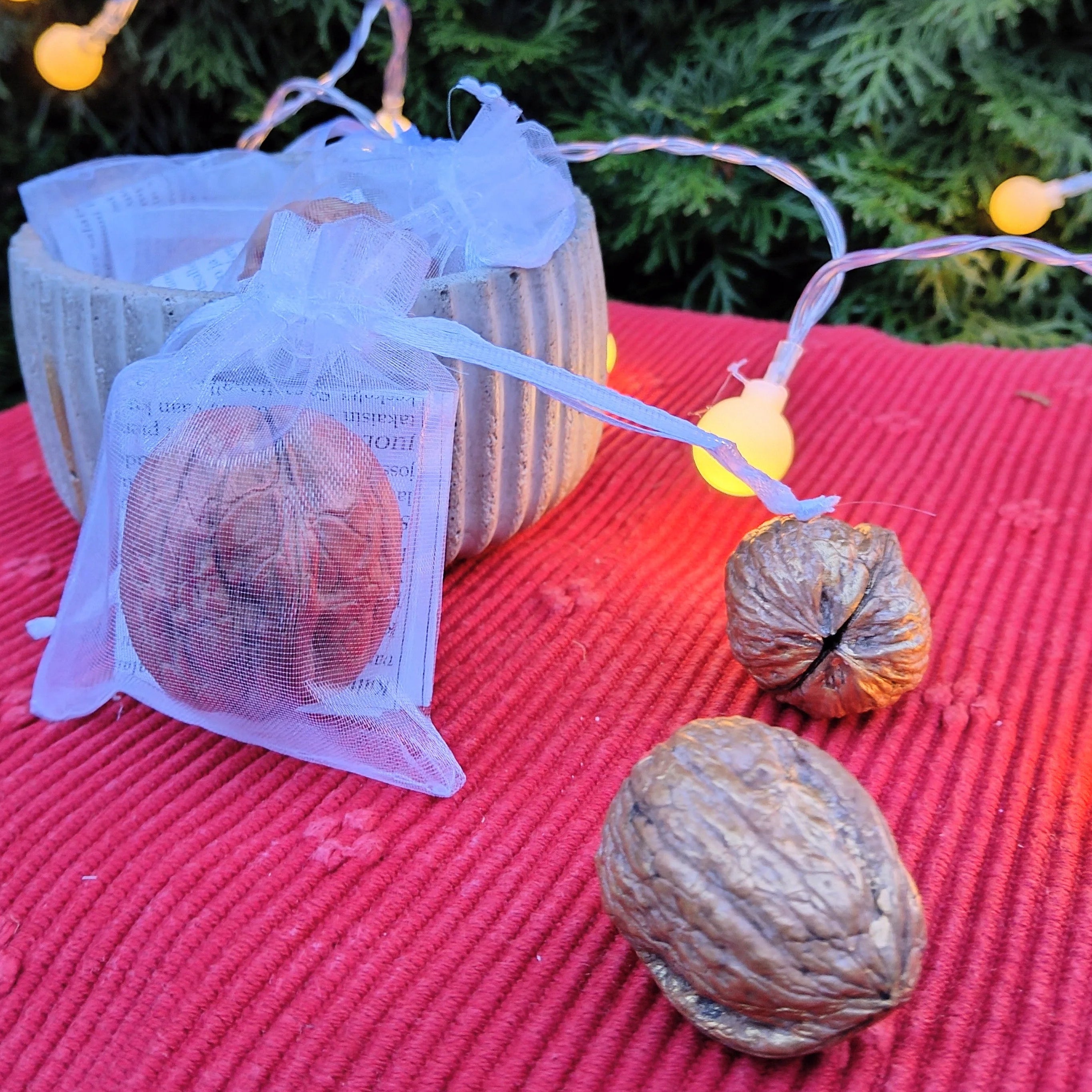Onnenpähkinä sopii täydellisesti uudenvuoden rituaaleihin, lahjaksi ystävälle, pikkujoulujen yllätykseksi tai pieneen arjen taikaan. Jokainen pähkinä on uniikki, käsin koottu ja ajatuksella valmistettu – kuin taskussa kulkeva pieni lupaus hyvästä vuodesta.