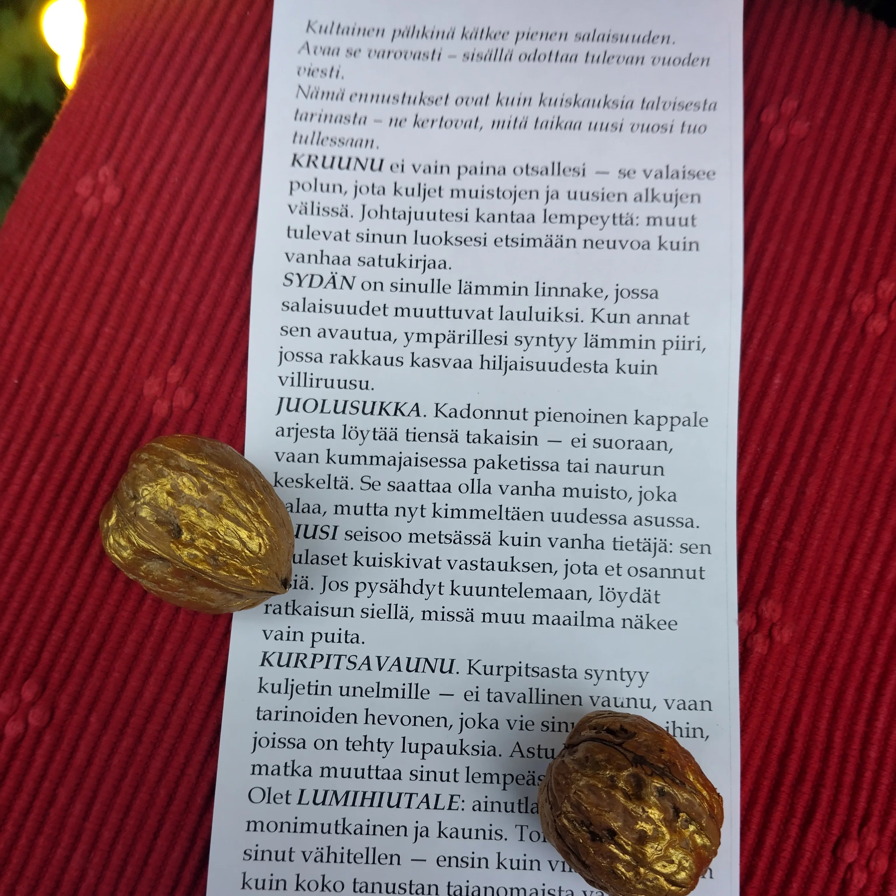 kultaiseksi maalattu pähkinä, jonka sisällä paperinen ennustelappi