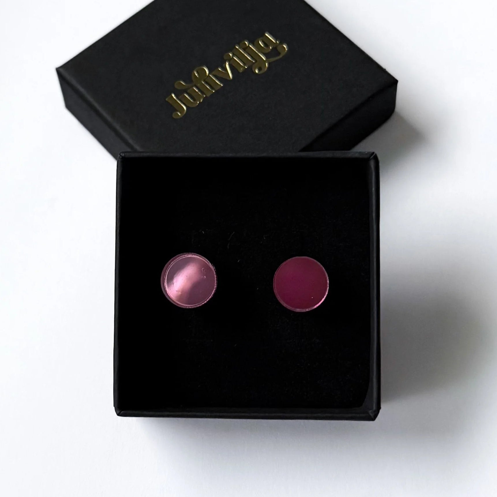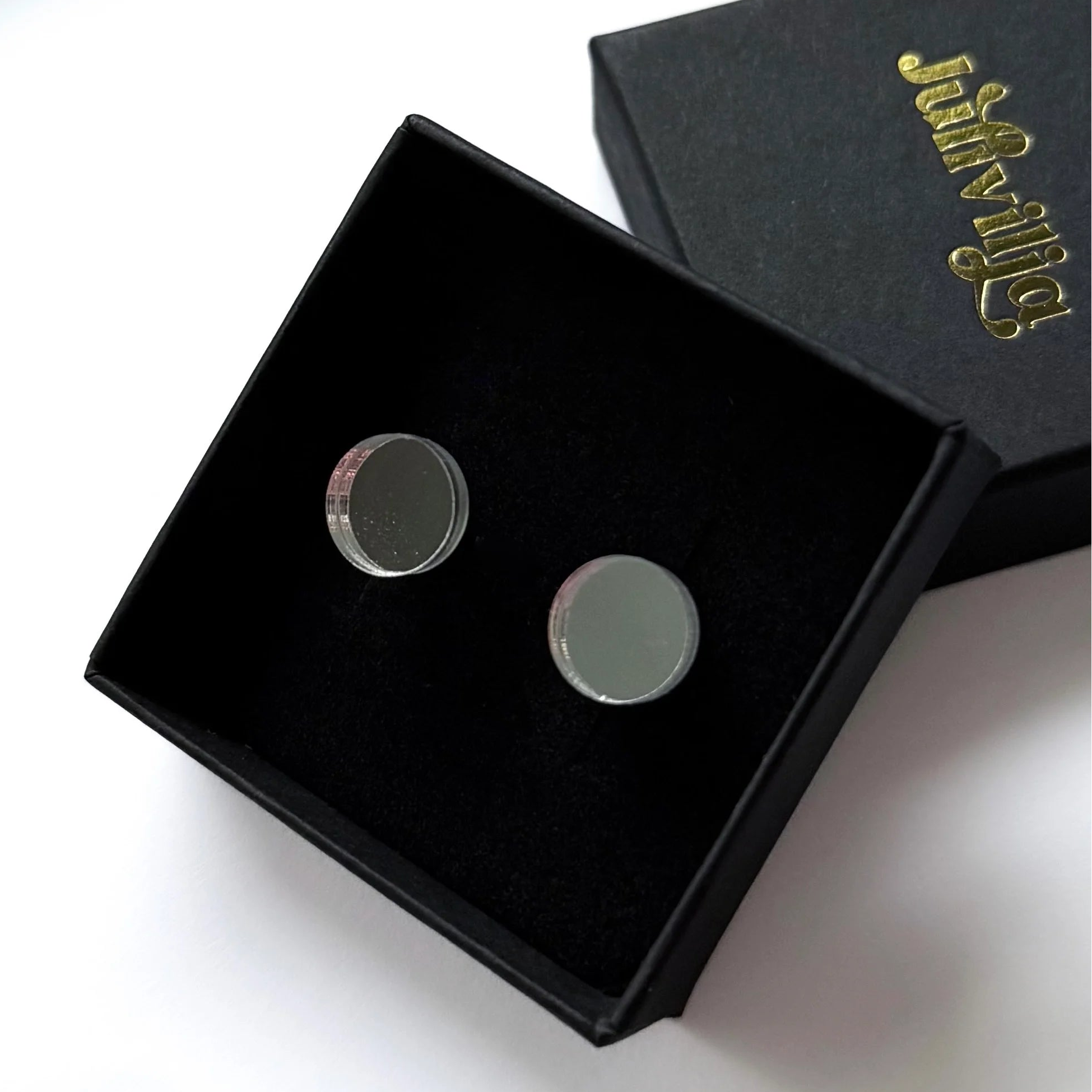 Pieni koru, iso vaikutus! Nämä modernit nappikorvakorut on valmistettu hohtavasta peiliakryylistä, joka heijastaa valoa kauniisti ja antaa asulle sleekin viimeistelyn. Minimalistinen muoto ja peilipinnan elegantti kiilto tekevät korviksista täydellisen valinnan tilanteisiin, joissa haluat näyttävyyttä ilman turhaa painoa.