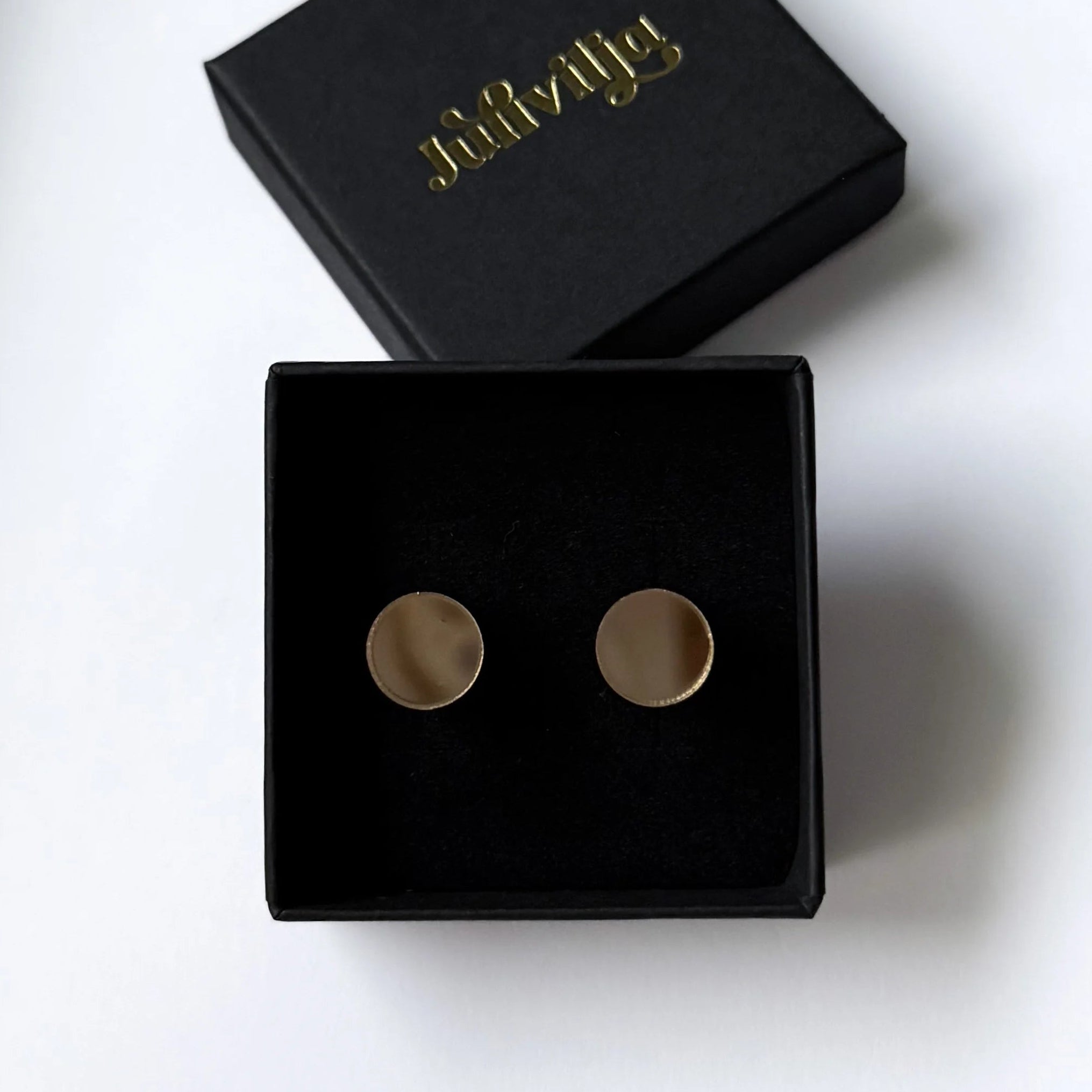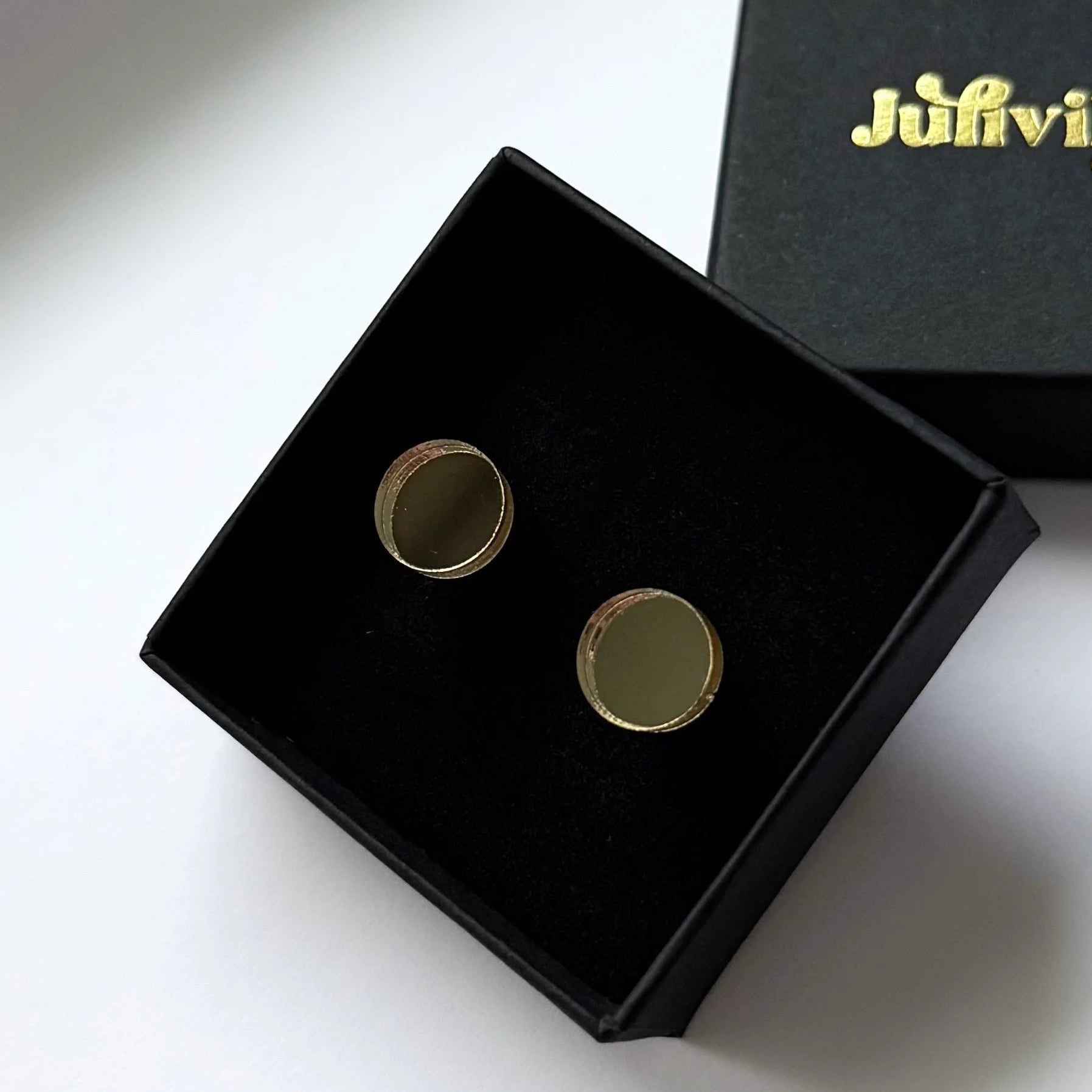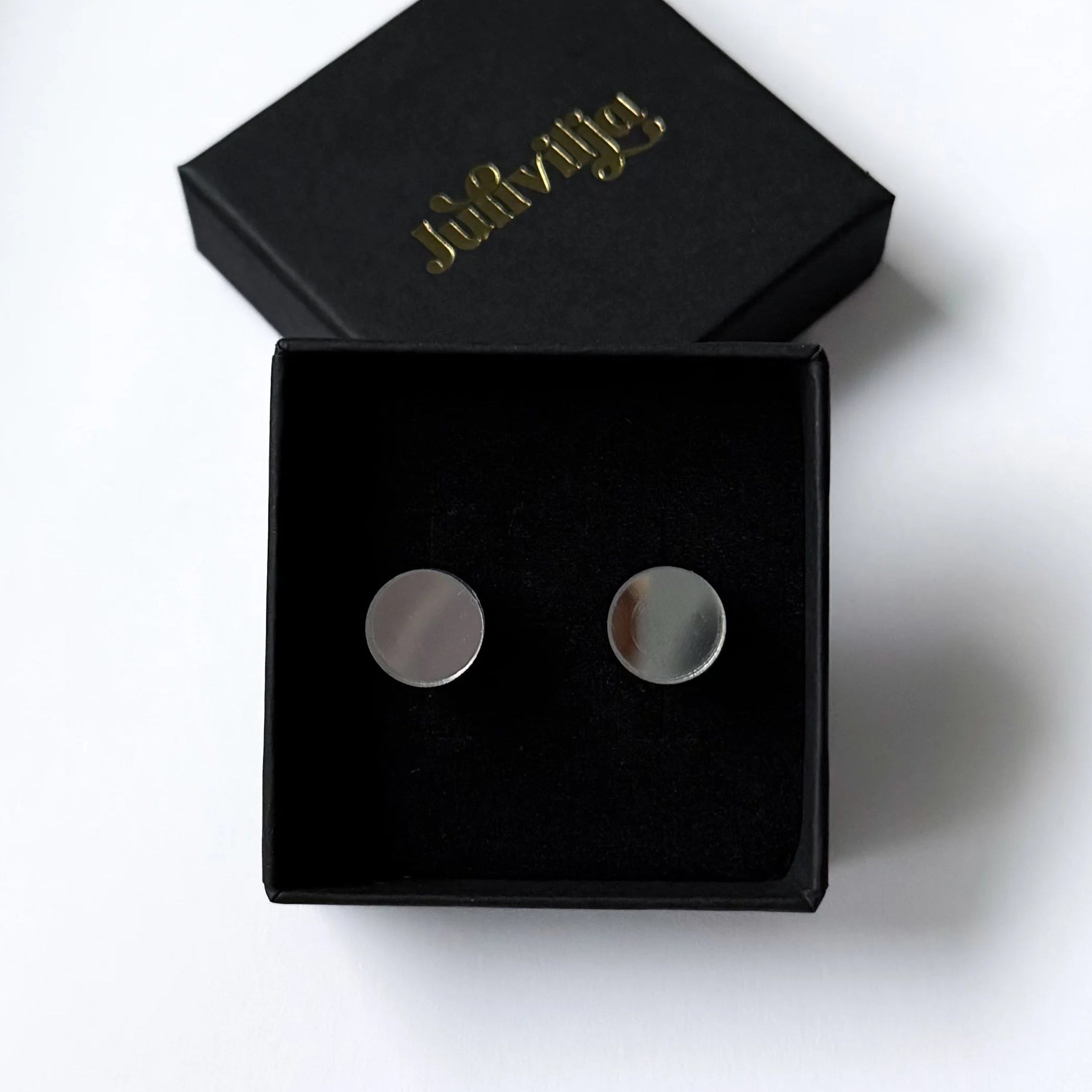 Juliviljan peilipintaiset nappikorvakorut säihkyvät modernilla kiillolla. Perfect match arkeen ja juhlaan!