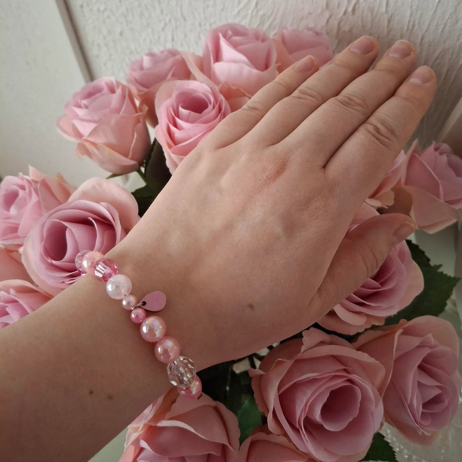 Katjataiteen rannekoru on söpö, kevyesti vaaleanpunaisena hohtava koru, joka tuo asuun ripauksen iloa ja herkkyyttä. Jokainen rannekoru on uniikki – helmien sävyt ja yksityiskohdat vaihtelevat, joten voit valita juuri sinulle mieluisan yksilön.
