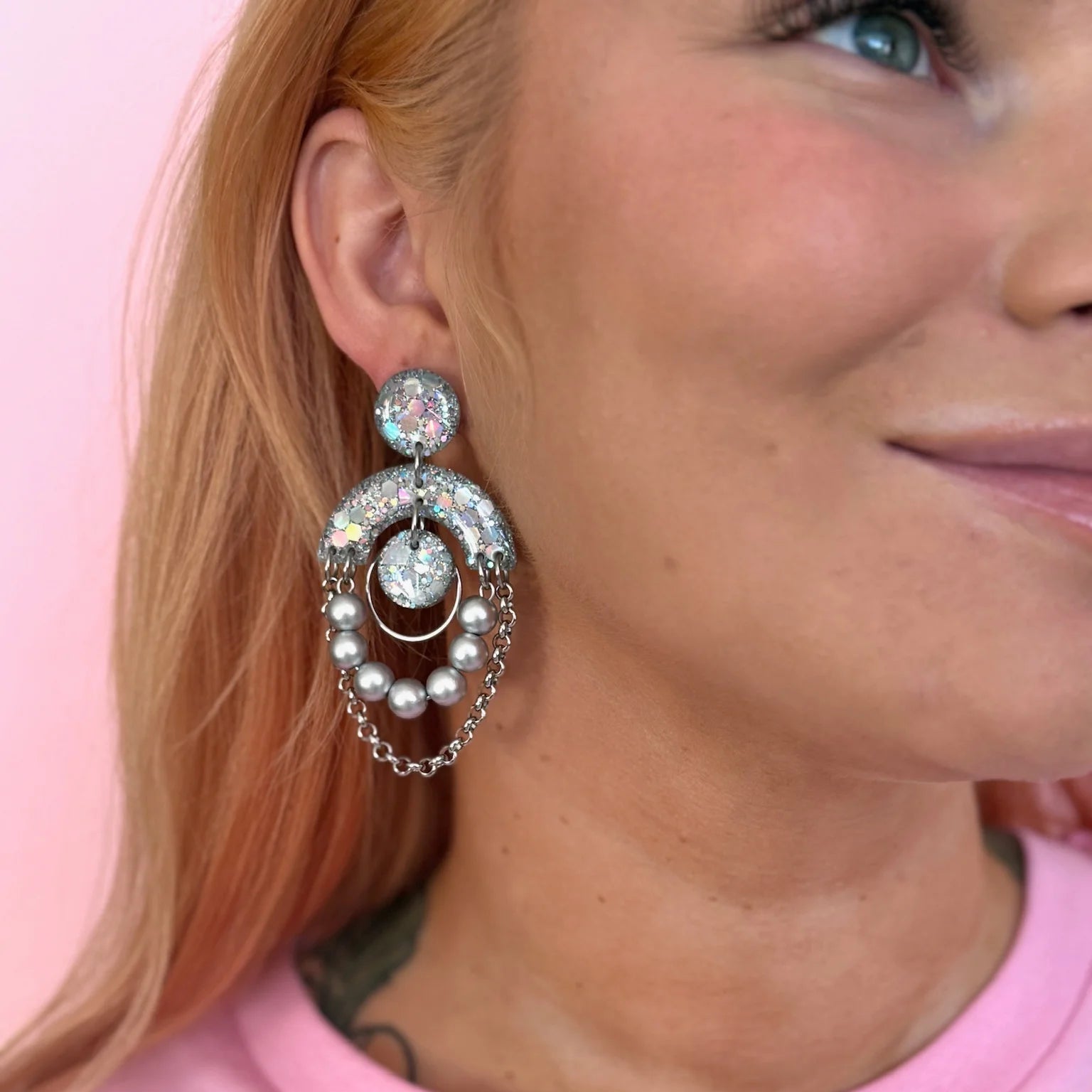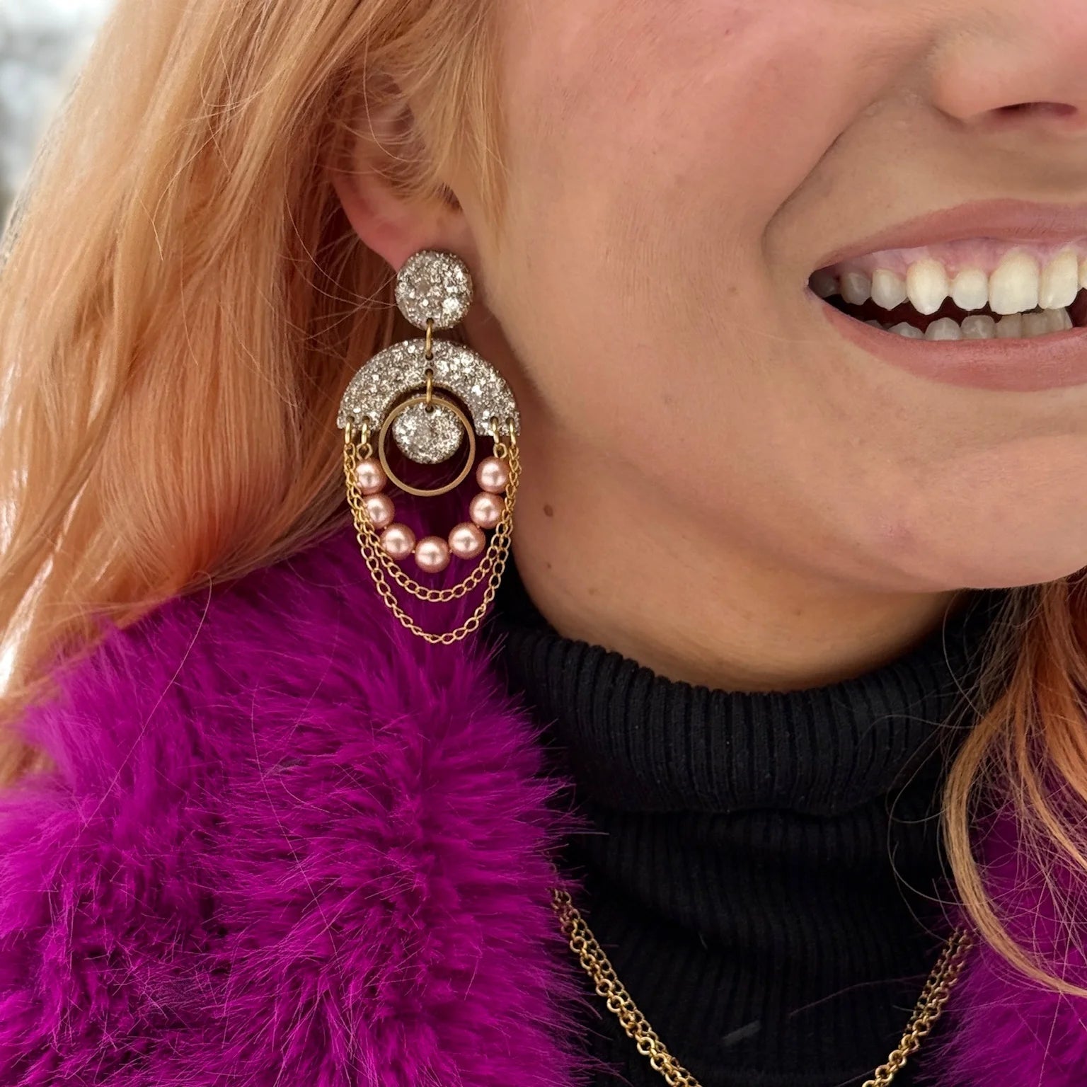 Käsin valmistetut Pimperot ovat koostaan huolimatta kevyet ja miellyttävät käyttää. Nappikiinnitteinen malli asettuu kauniisti korvaan ja tekee korvakoruista tukevat myös koko päivän käyttöön. Koruhartsista valmistetut palat ja akryylihelmet ja rock-henkiset ketjut luovat mielenkiintoisen ja näyttävän yhdistelmän, joka toimii niin juhlapukeutumisessa kuin arjen piristäjänä.
