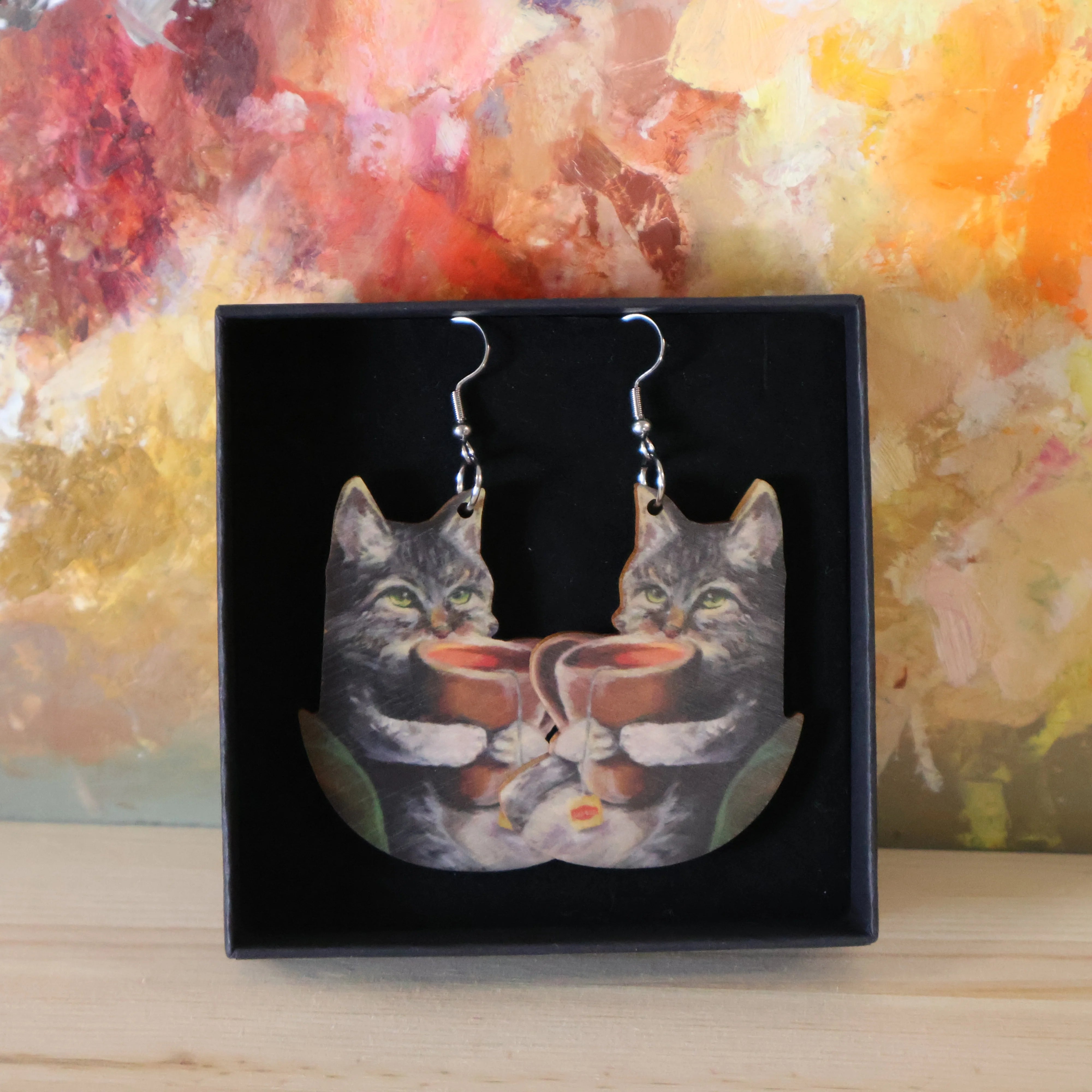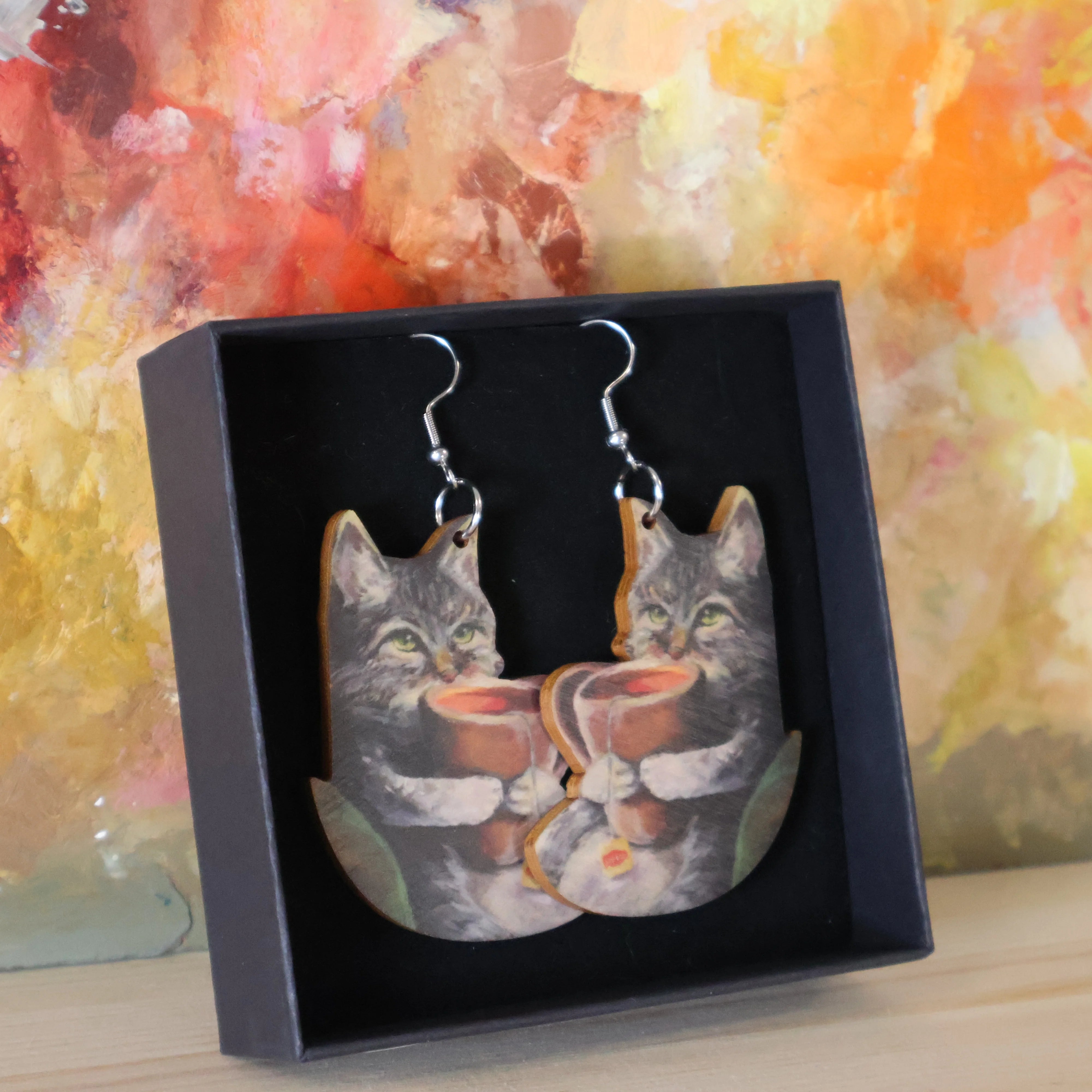 Ateljee Tiitu Peltomaan hurmaavat Teekissa -korvakorut on leikkisät koivuvanerikorvikset kissojen ja teen ystäville!