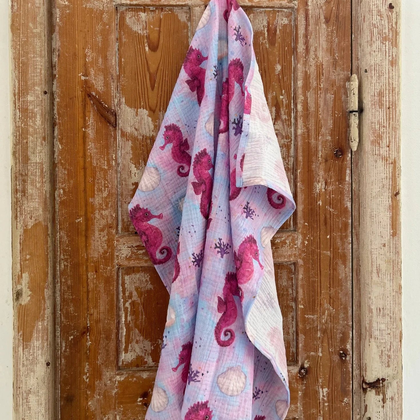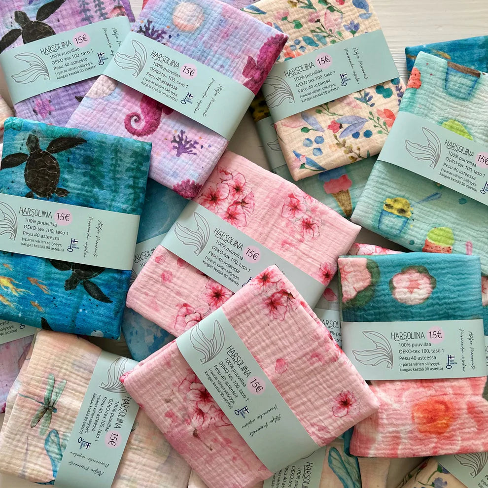 Ateljee Merenneidon harsoliina on pehmeä, käytännöllinen ja kaunis arjen apuri, joka hurmaa niin vanhemmat kuin vauvatkin. Liina toimii moneen – esimerkiksi pukluliinana, peittona, pyyhkeenä tai vaunusuojana. Jokainen liina on valmistettu GOTS-sertifioidusta, kaksinkertaisesta harsokankaasta, joka on 100 % puuvillaa – hellä vauvan herkälle iholle ja turvallinen käyttää.