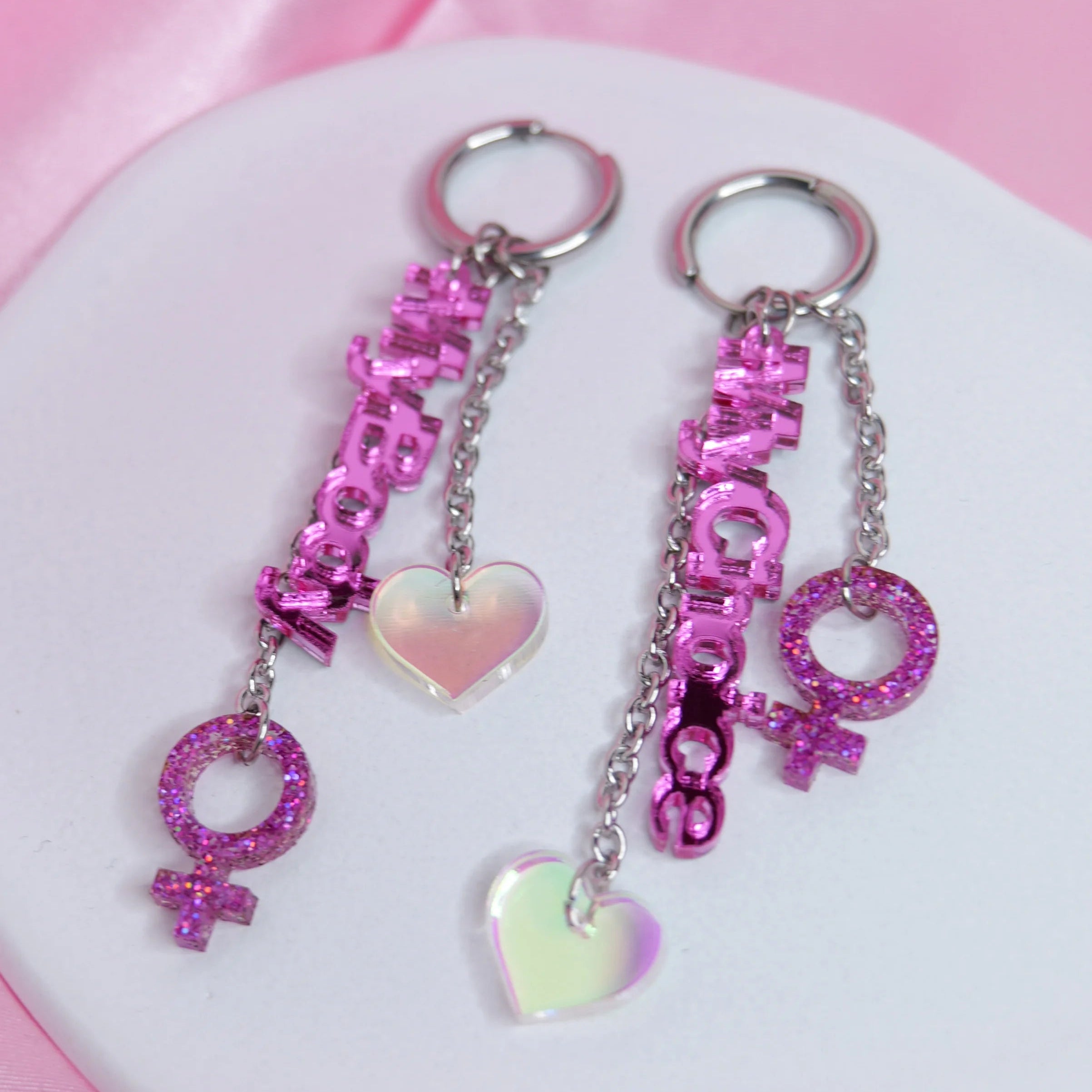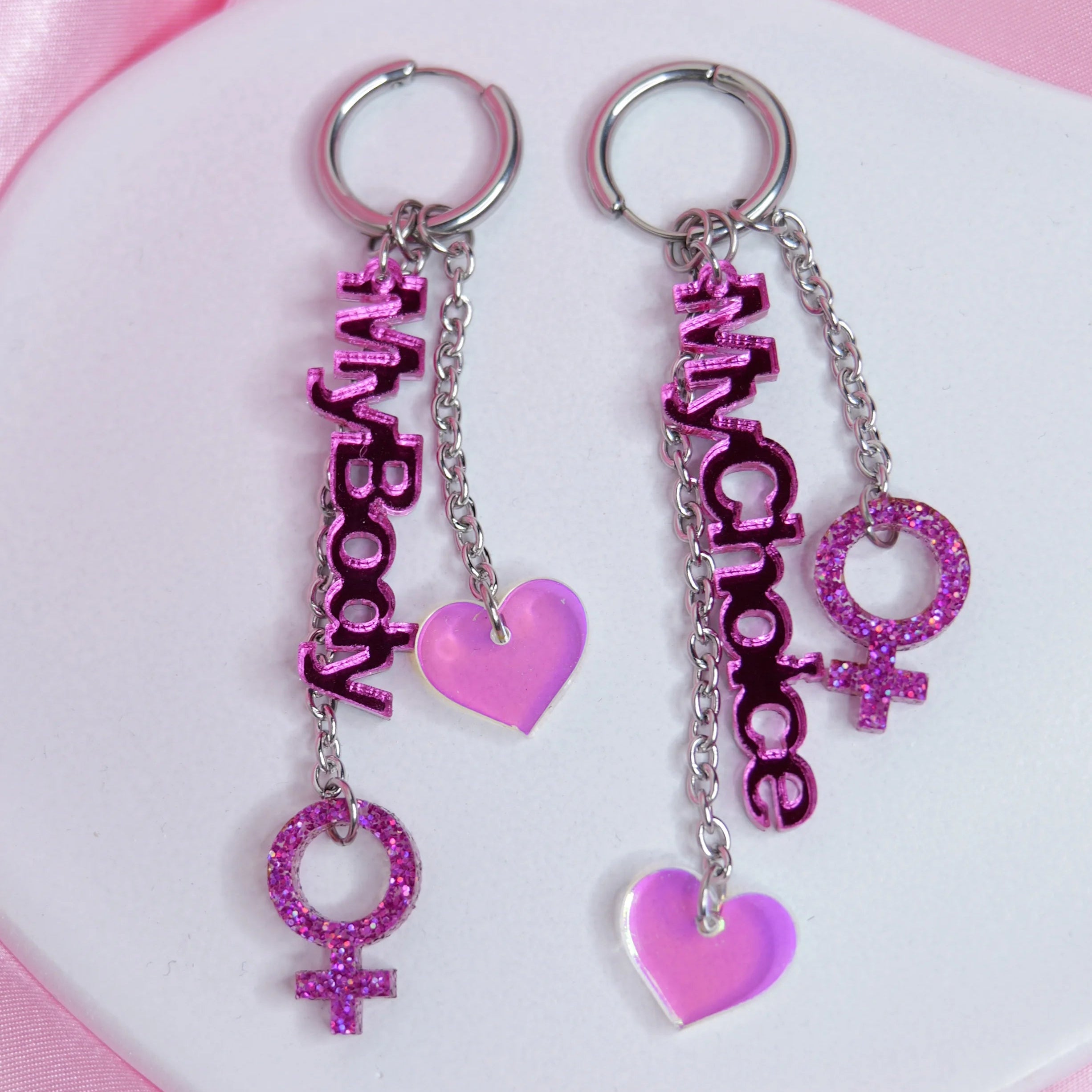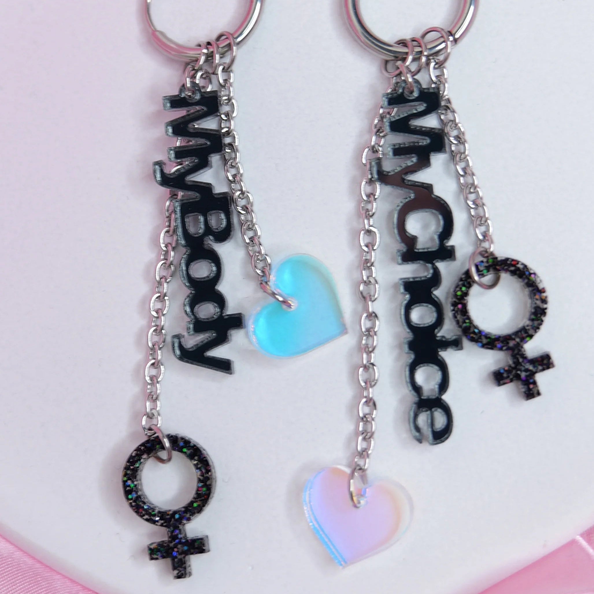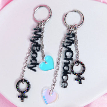 Korujen vahva “My Body, My Choice” -sanoma tekee niistä täydellisen valinnan kantajalle, joka puolustaa oman kehon vapautta ja yksilön oikeutta päättää itse. Kimaltava ♀-symboli ja hologrammiset sydämet tuovat koruihin säihkettä, energiaa ja voimaa, kun taas kevyet akryyliset osat tekevät niistä miellyttävät käyttää näyttävyydestään huolimatta.